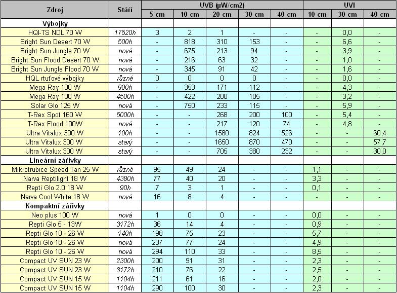 Měřena byla pouze jedna 160W bodová lampa používaná cca. 5000h a zcela nová plošná lampa s výkonem 100W. Bodová lampa vyzařuje na svůj výkon poměrně málo UVB, navíc pouze ve velmi štíhlém paprsku. Má však vysoké hodnoty UVA záření. Její použití je myslím neefektivní, což si patrně uvědomuje i výrobce a pravděpodobně zastavil výrobu této verze. Verze plošná (Flood) je naopak dobře použitelná pro všechny heliofilní ještěry a želvy k celodennímu použití.