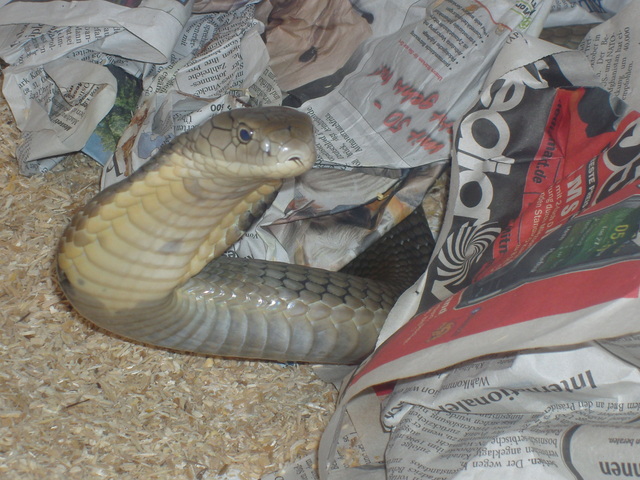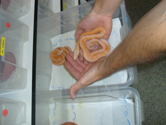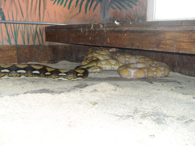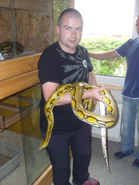 Hurá do víru terárií. Prohlídkou nás provádí Patrick v anglickém jazyce. Nejprve nám vypráví o tom, jak kříží různě zbarvené jedince a získává tak fantastické barevné mutace. My suše přikyvujeme, neboť jsme oba milovníci přírodních zbarvení hadů a tak nekoukáme na všechny ty „sanfajry a tajgralbiny“ s úžasem, který si možná tyto „pastelky“ zaslouží. Prostorná terária naproti rack systemu s mláďata ukazují první dospělé reticulajdy zhruba 4-5 metrů velké. Albíny i tigery poznávám okamžitě. V levém horním rohu vyššího terária vidím dospělou samici formy Kayuadi a usmívám se tak nad označením některých chovatelů, kteří jí pro lepší prodej označují jako superdwarf. Tři a půl metru dlouhý had už opravdu jako super trpaslík nevypadá. Pokračujeme dál a já přes sklo pozoruji svůj sen, 1.1 Broghammerus reticulatus, forma Bali. Žlutohlavé krajty s nádherným žluto černo šedým kontrastním zbarvením se svými 350 cm ukazují maximální snesitelnou velikost zvířat, která mohu chovat v důstojných podmínkách. Honza vzápětí začíná být zklamaný. Vidí konečně Madu. Nevýrazné zbarvení těchto zvířat z nich dělá ošklivá káčátka v říši narcisů. Páreček visí ze stromu a jednomu z hadů kouká z tlamičky půl kuřete. Překvapeně se ptám, proč mají 2 hady v jednom teráriu a neoddělují je ani na krmení. To se neperou? Dostává se mi odpovědi, že občas ano. Pokračujeme dále a vidíme prostor, který znám z německých zpráv. Ubývala ho Big Betty, 7 a půl metru dlouhá samice pevninské formy. Bohužel před rokem zemřela (prostě nedokážu napsat „uhynula“) a tak bereme zavděk i o metr kratším hadem, kterého nám Patrick pro představu velikosti trochu povytáhne. Po chvíli už stojím v teráriu a hada si poměřuji. Big Betty prý byla 2x tak robustní. To si ani nedokážu představit, neboť i toto je pěkný macek. Procházíme do prvního patra Filaretic a na pozdrav se proti sklu vztyčuje královská kobra. Inteligentními očky nás pozoruje a vědoma si svého respektu zůstává bez hnutí stát. Pro „hanušky“ chová Patrick doma užovky, kterými tyto krále hadů krmí. Jdeme si vybrat hady a procházíme kolem párečku Madu. Z kuřete už nevidíme ani nožku, zato jeden had se do druhého pěkně natvrdo zakousnul. Patrick nelení a s pomocí kolegy od sebe hady odděluje. Rozzuření hadi se snaží na oplátku kousnout nás. Když Patric zvedá samici ze země, dostane spršku čerstvé hadí moči. Vzhledem k nepěknému zbarvení a momentální zuřivosti, si Honza k mému velkému překvapení vybírá Bali. Jeho volbu vítám, neboť si budeme moci vyměňovat informace a postřehy a společná chov těchto hadů nás ještě víc stmelí. Vybíráme si zvířata pro chov, prstem projíždím páteř hadů, dáváme je do pytlů a Patrick nám je pěkně označuje včetně jmen P a J.