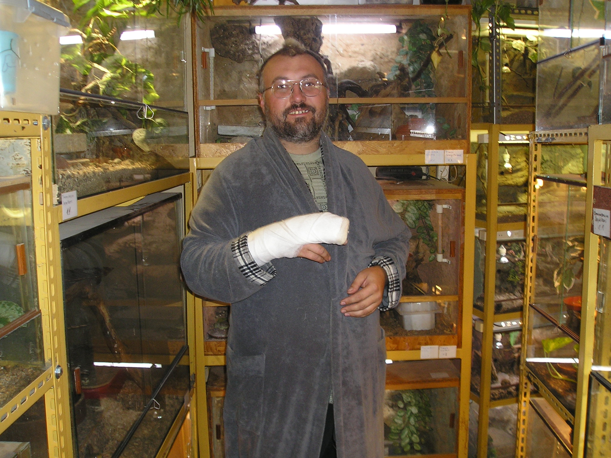 . Včera jsem u něj byl. Akorát teda zrovna spal (na zemi vedle otevřenýho terária s mambitchem). Vzbudit se mi ho nepodařilo, tak jsem si jenom vzal nějaký myši a zase jsem jel