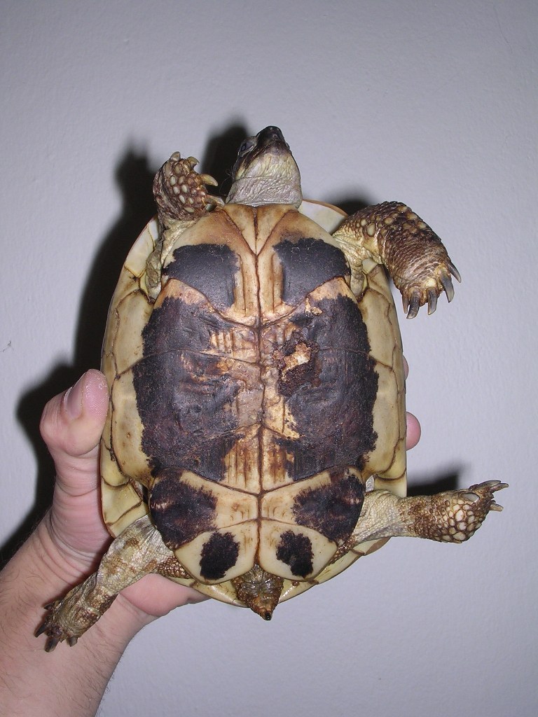 Prosím o radu zkušenější chovatele než jsem já,tohoto samce jsem před lety kupoval od chovatele jako čerstvě vylíhlé mládě testudo h.h.po shlédnutí fotek p.Khora už si nejsem tak jist jestli se opravdu jedná o t.h.h.či o t.h.b.nebo o křížence předem moc děkuji za odpovědi [img]http://img300.imageshack.us/img300/794/1002089ae9.j pg