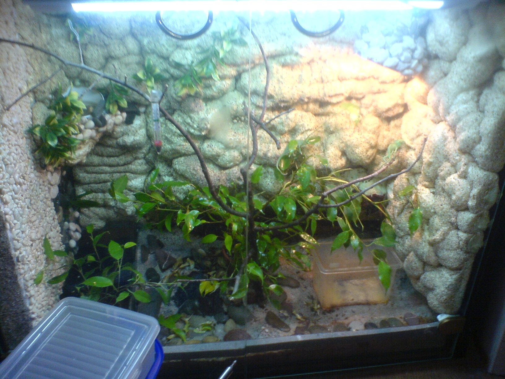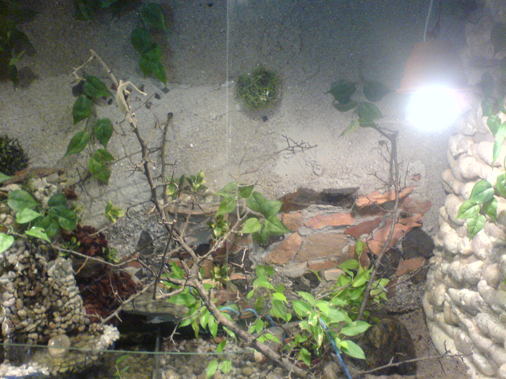 Taky mám jedno terko v obýváku a pár v jídelně - tam ty květináče ještě jsou. Ta zmiňovaná skříň ale bude stát v "budoucí hadárně", takže by holá žárovka nemusela až tak vadit. Pro příznivce přírodních terárií - ano, taky jsem jejich zastáncem, nepoužívám žádné noviny, ale přírodní materiály jako písek nebo písek s rašelinou. Zvířata rozhodně nemám "jenom na chov", ale hlavně pro "potěchu oka", přesto si myslím, že pokud má had vyhovující prostor a substrát, misku s vodou, vhodné úkryty, nějaké větve a kořeny na prolézání a třeba umělou kytku, aby se mohl na té větvi trochu schovat, tak to, že nemá přes žárovku květináč mu vadit vůbec nebude.