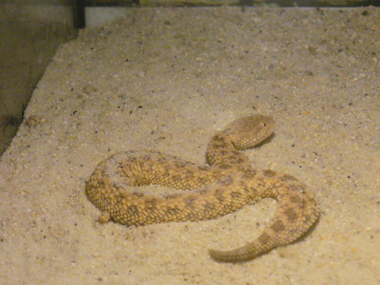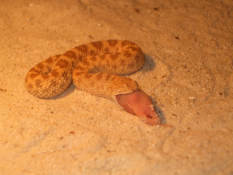 Díky. Jinak počítám s pouštním pískem k cerasteskám do budoucna. Tohle je foto jednoho z loňských mláďat, které má v současnosti délku cca 25 cm, a jako mláďata byla (tedy ještě stále jsou) chovány na říčním písku o průměru zrnitosti cca 1-3 mm. A kupodivu jim tato hrubší zrnitost vůbec nikterak nebrání ani při zahrabávání