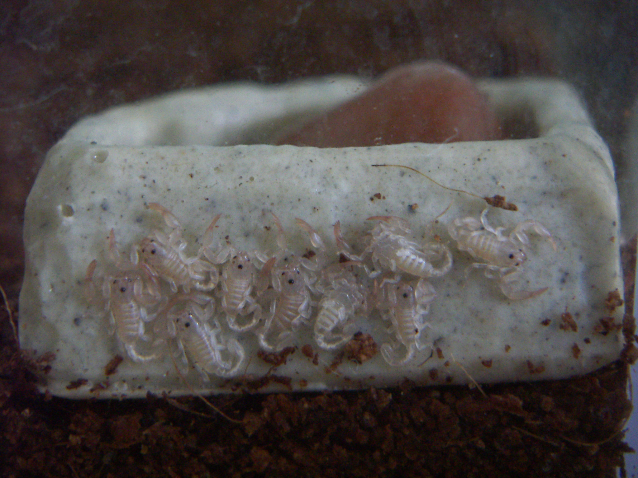 A s těmi Liocheles australasiae, tak krmit můžeš buď malými cvrčky v 2-3 sv., ale ti se schánějí dost špatně, jen u různých firem jako je např. Acheta atd.., no a nebo octomilkami, ale ty někteří štíři nechcou, musíš to zkusit. Já třeba četl že mláďata lychasů taky nechcou ostomilky, no a ti moji je baští s velkou radostí. Právě dneska sem si domů donesl násadu octomilek, tak sem jim je tam hodil, no a začala žranice žes to ještě neviděl, v každém klepetu jednu mouchu, potom v klepítkách jednu a ještě se snažili lovit další, ale to už jim moc nešlo