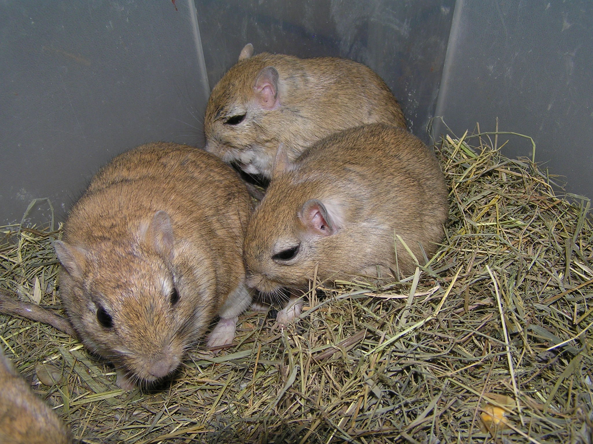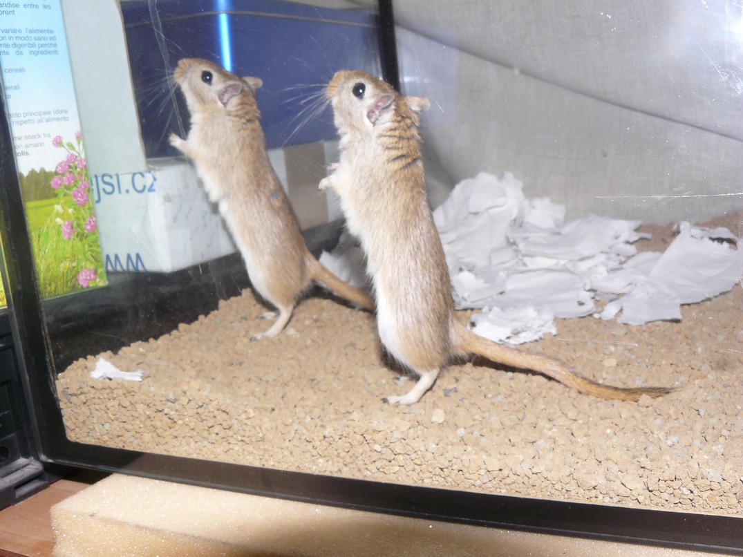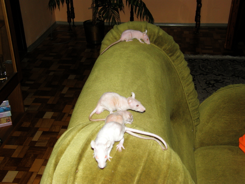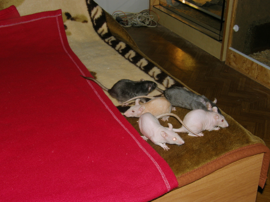 Takže na obrázcích morčátka Róza, Máša, Kačka(ta s rozetkou na čele - má papíry), myš bodlinatá Isám (ještě má bráchu Ahmeda)a poslední chlupáč Hraboš Brandtův - celkem jsme jich měli osm - přebytky z etologického pokusu na naší univerzitě(samička Kuba, mládě Malina - náš odchov).