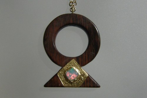 Zvukomalebný šperk. Písmeno S psané hlaholicí vyrobené z hadího dřeva. Ozdobeno plátkovým zlatem a opálem.