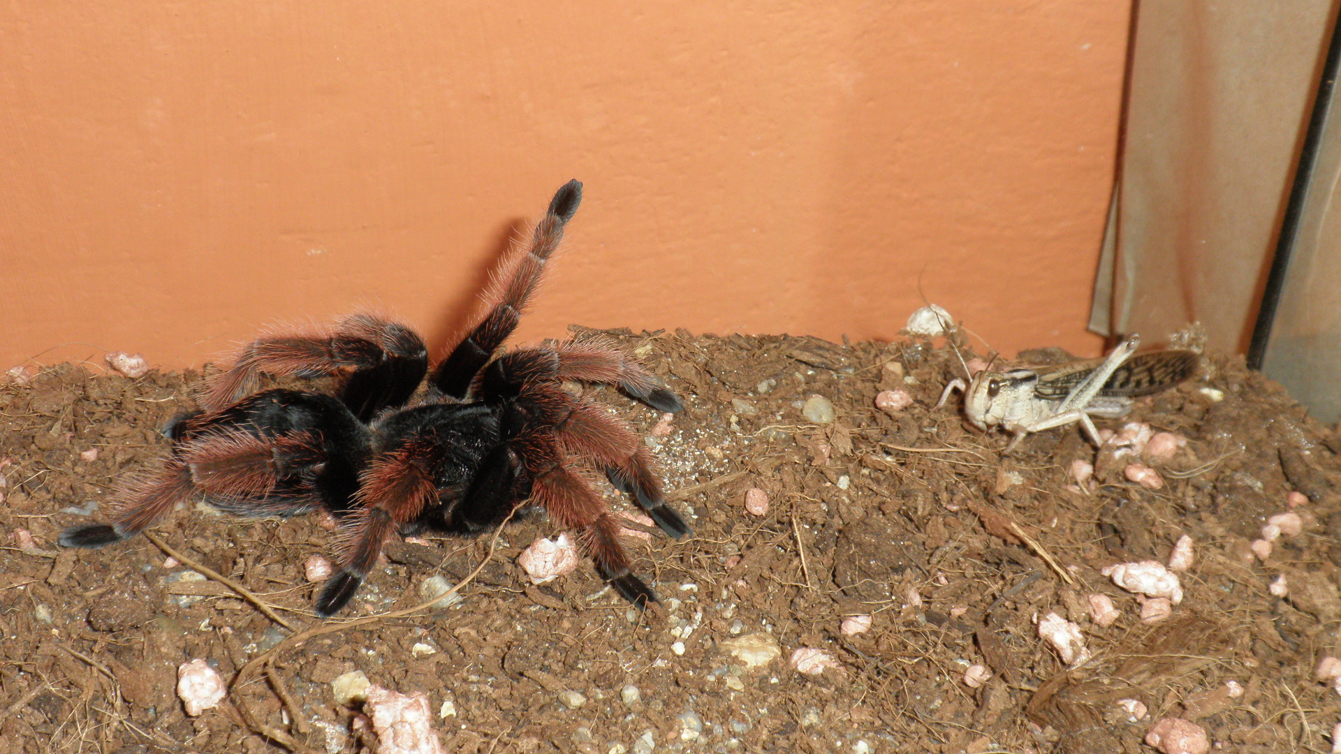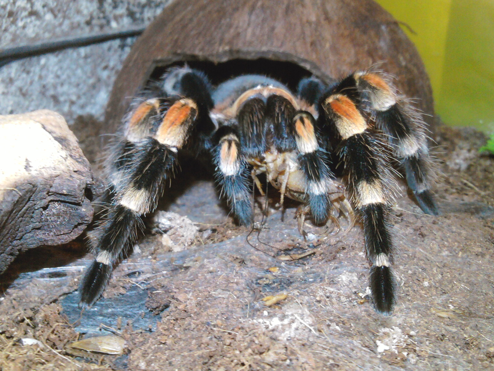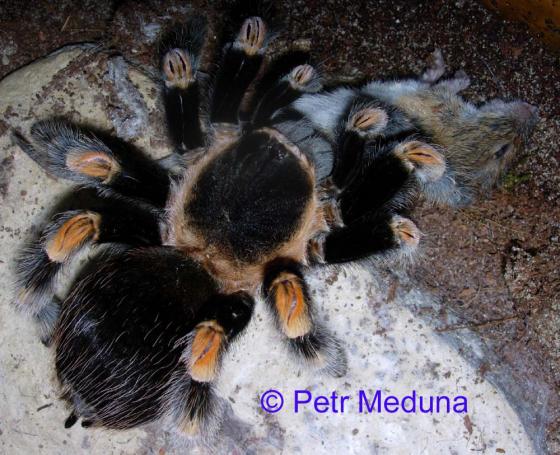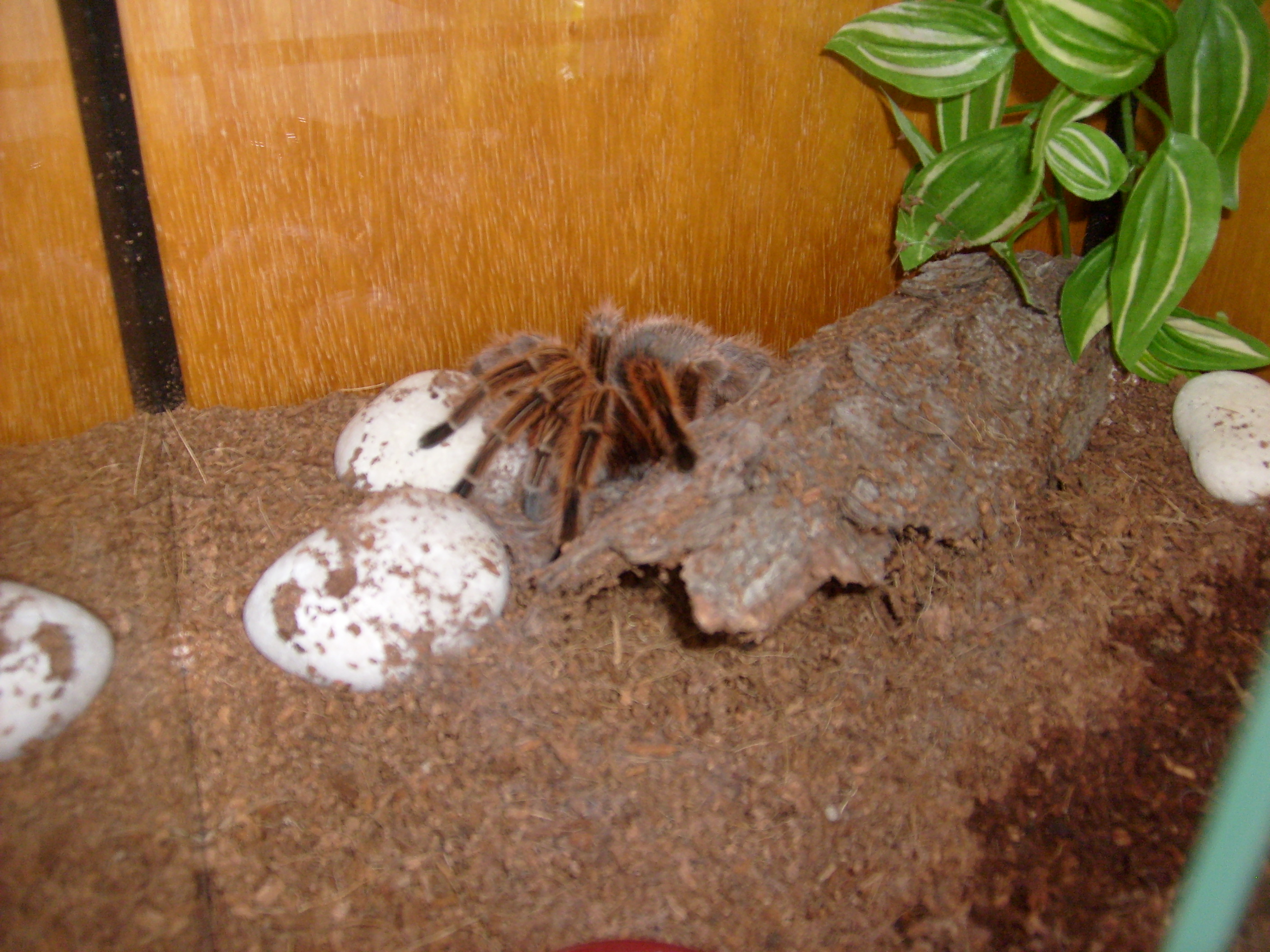 Tak jsem konečně vyfotil moje prcka je to zatím můj první už plánuju další - brachypelma smithi nevim presne ktery svlek budu rád když mi to objasníte