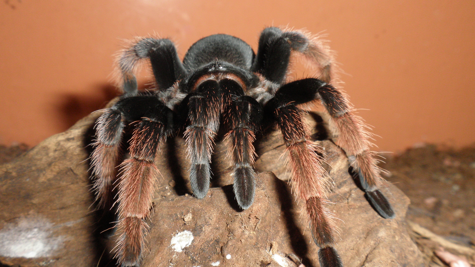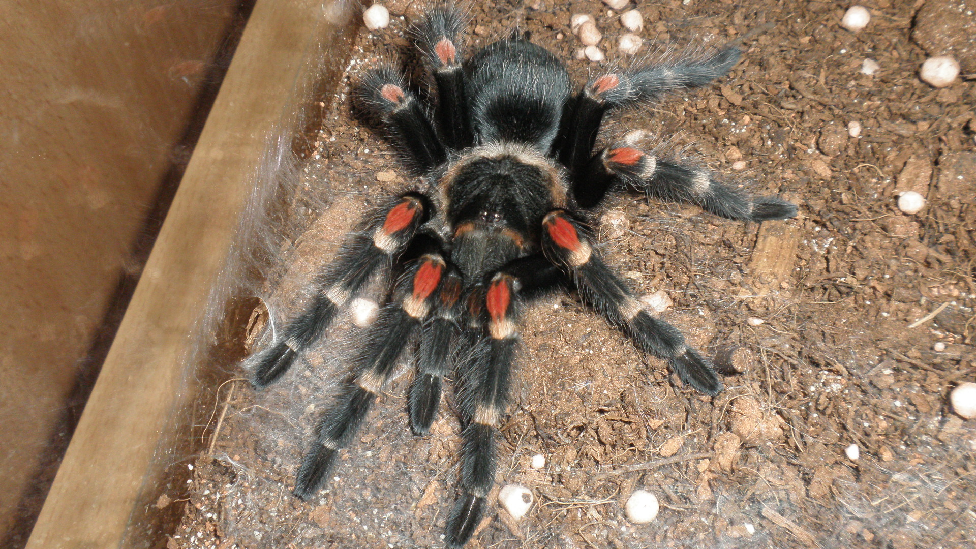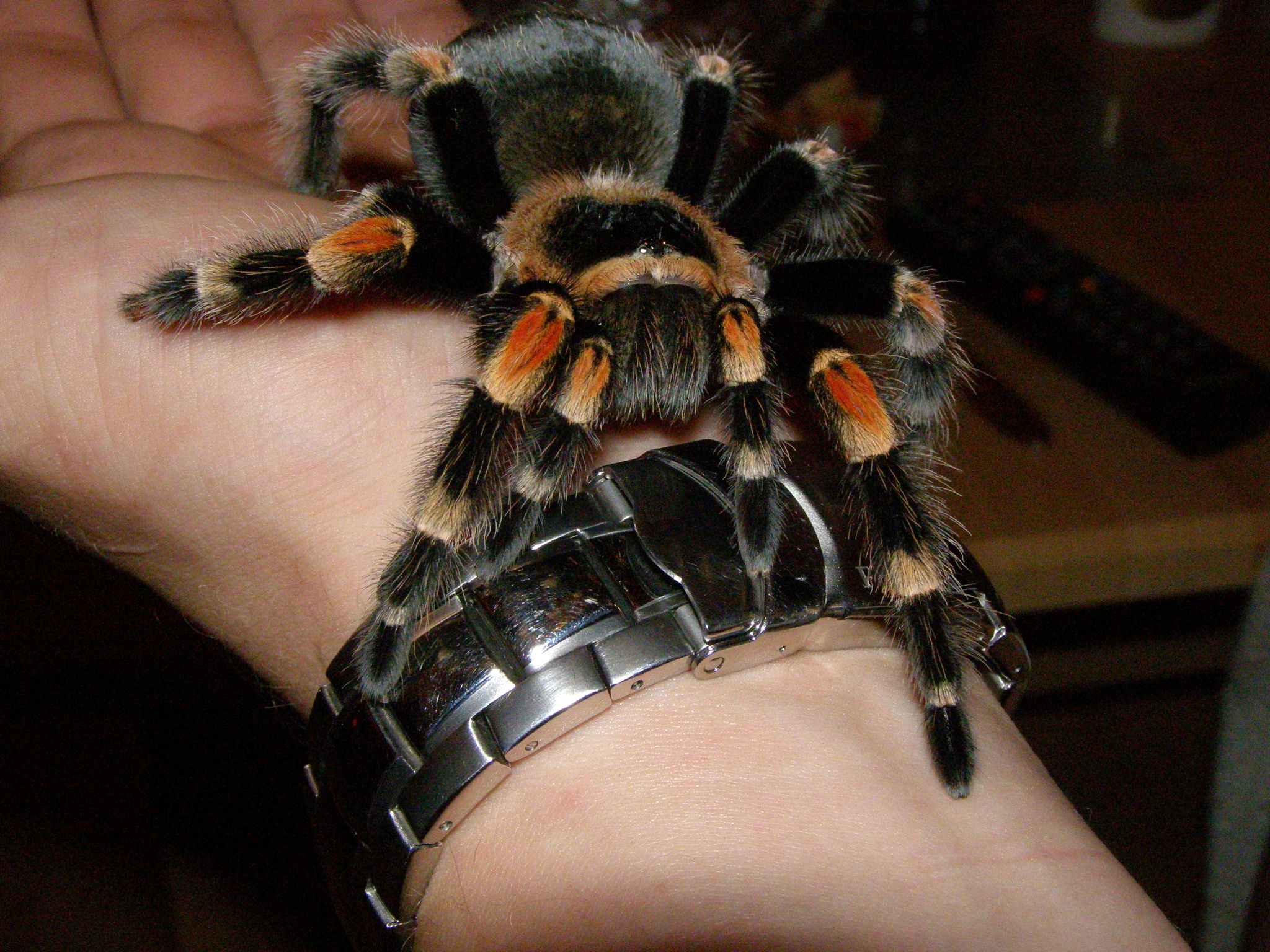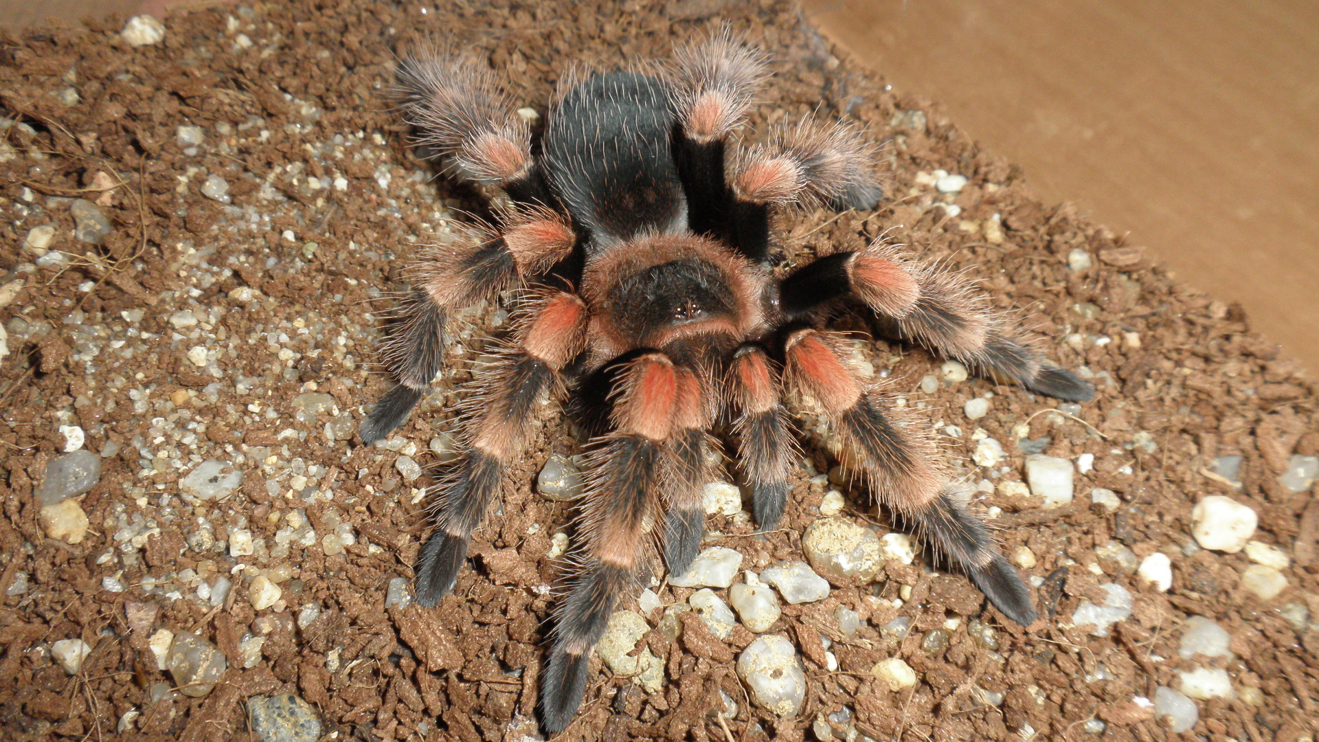 Tak jsem konečně vyfotil moje prcka je to zatím můj první už plánuju další - brachypelma smithi nevim presne ktery svlek budu rád když mi to objasníte