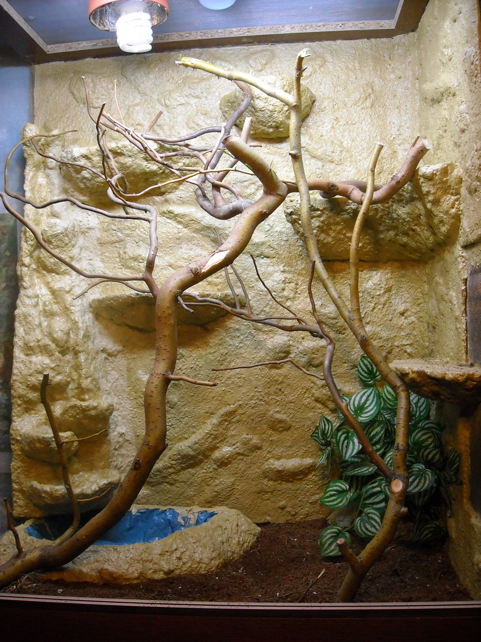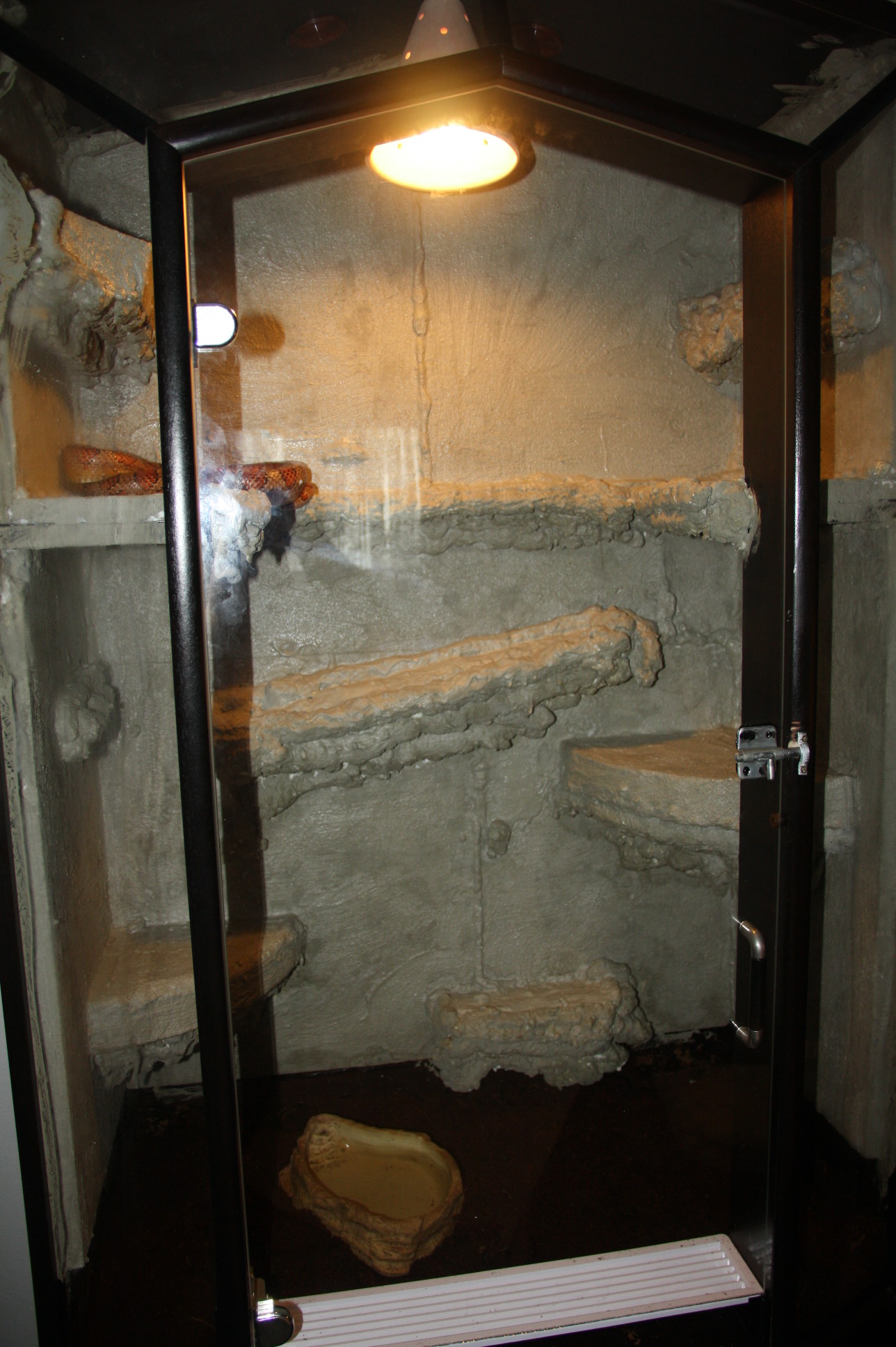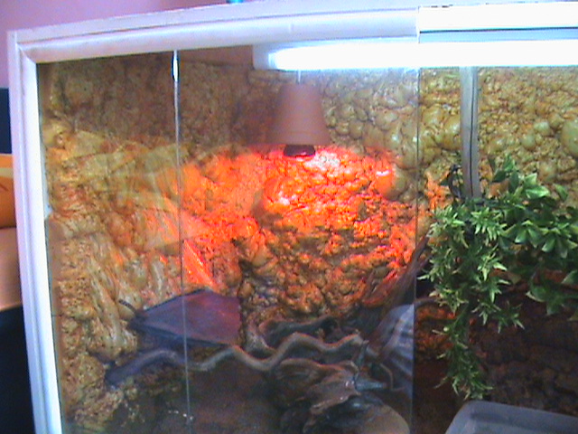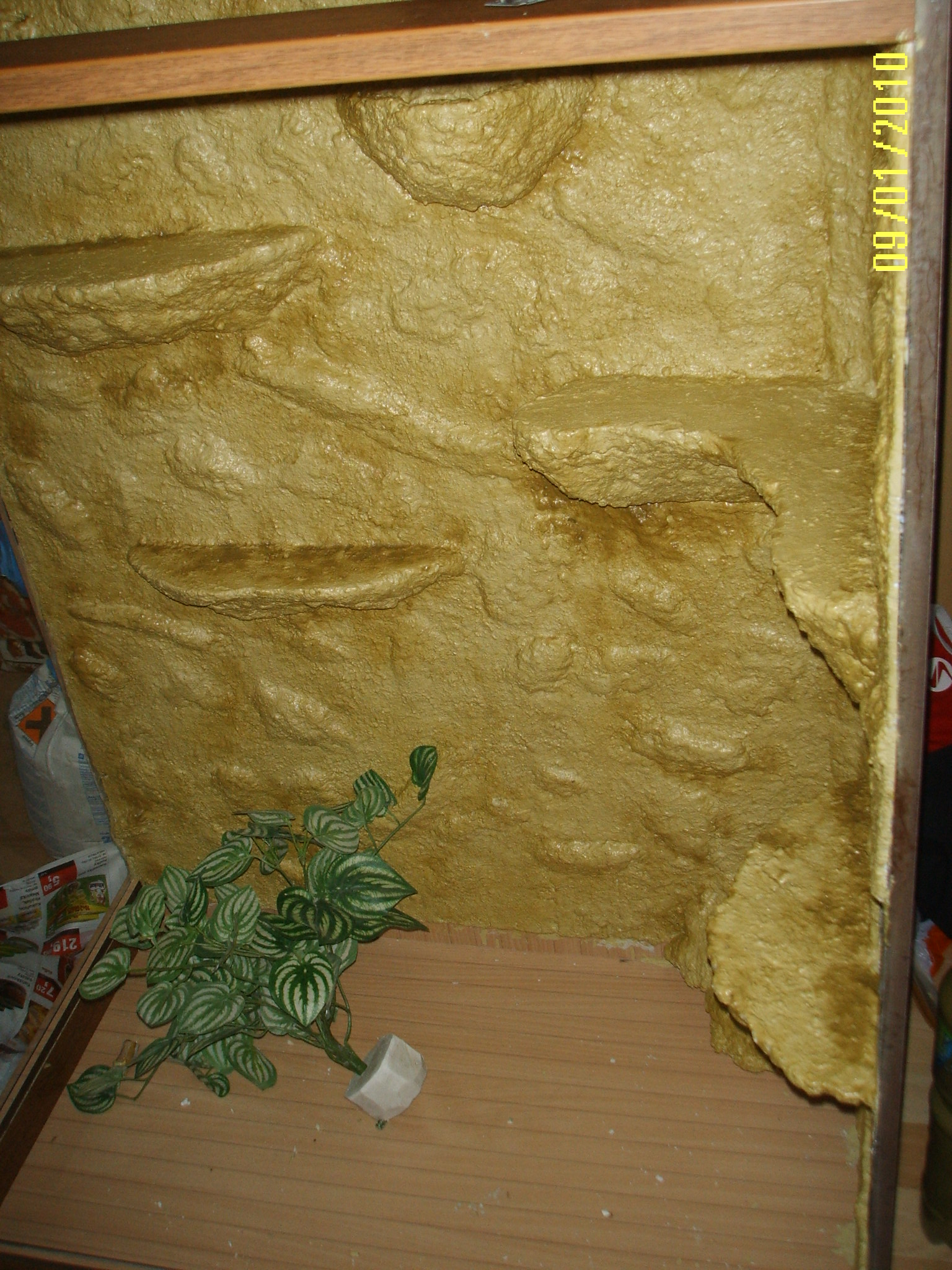 Tady je terárko s pozadím z lepených bílých akvarijních kamínku a písku. Výstupky jsou silikonem nalepený kusy škvárovek (plynosilikát). Taktéř polepeny kamímky. Terárko 80x50 plocha je obýváno Guttatusem... (za připomínky a návrhy budu vděčný)