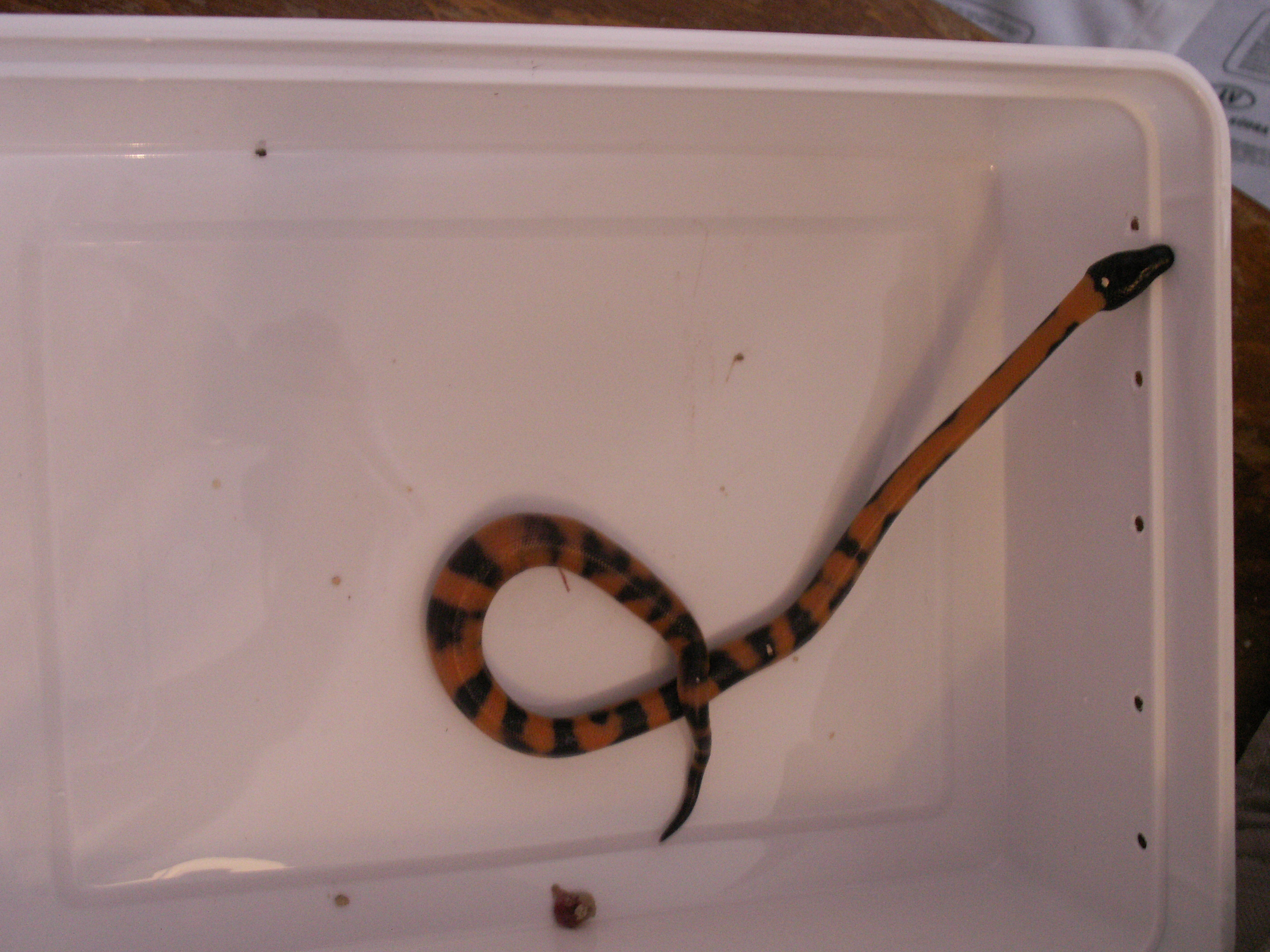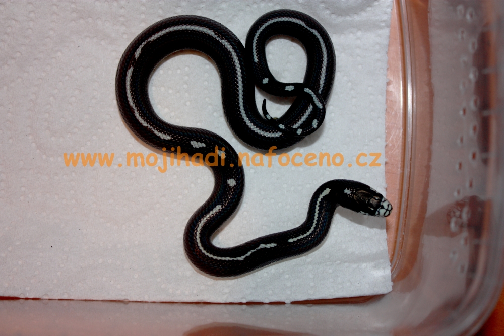 Dnes první vylíhlá Lampropeltis mexicana thayeri "triangulum", další čtyři sourozenci zatím čekají ve vejcích. Fotka nic moc extra, teď v noci už je houby světlo, časem pořídím lepší:-)