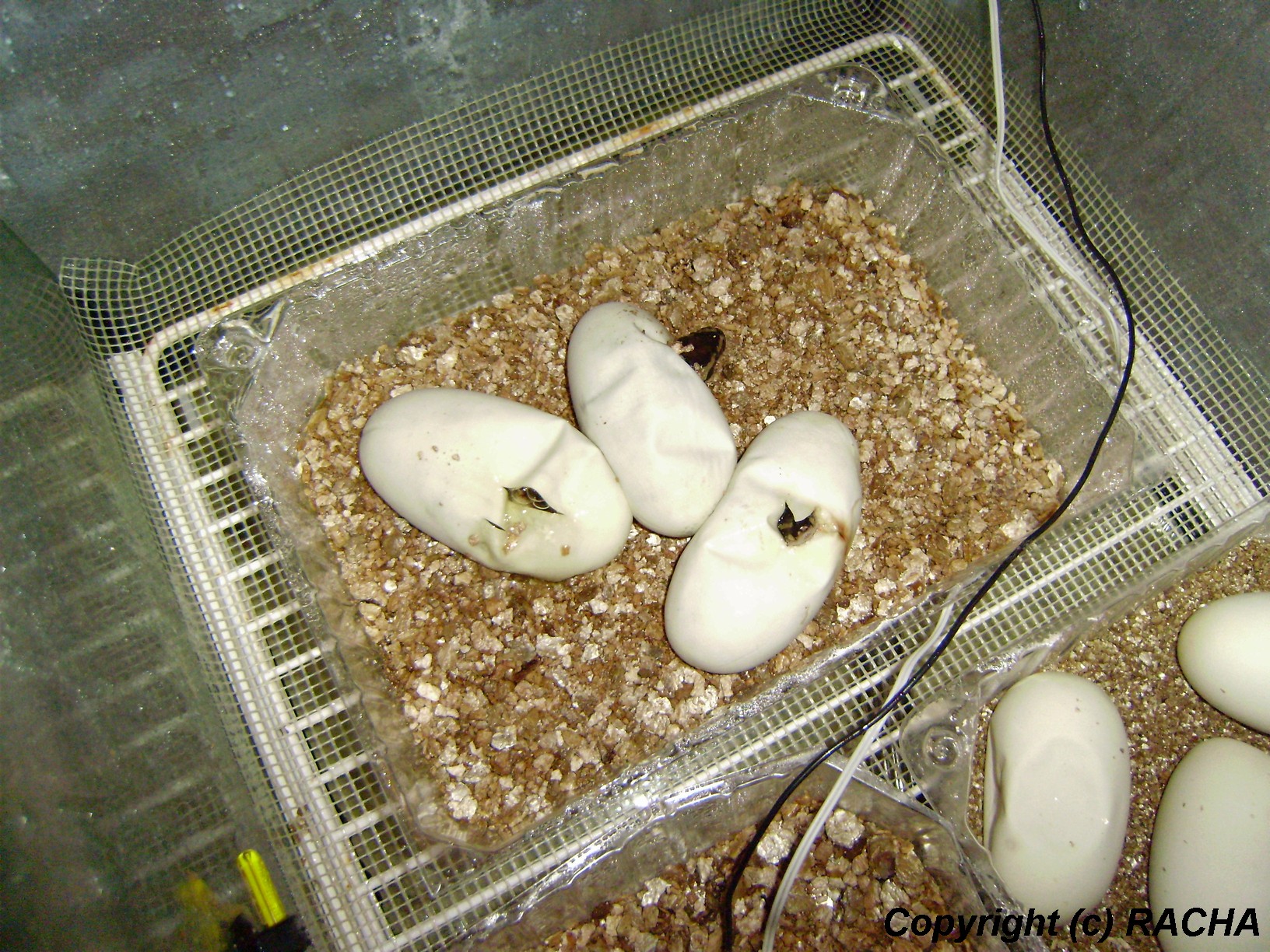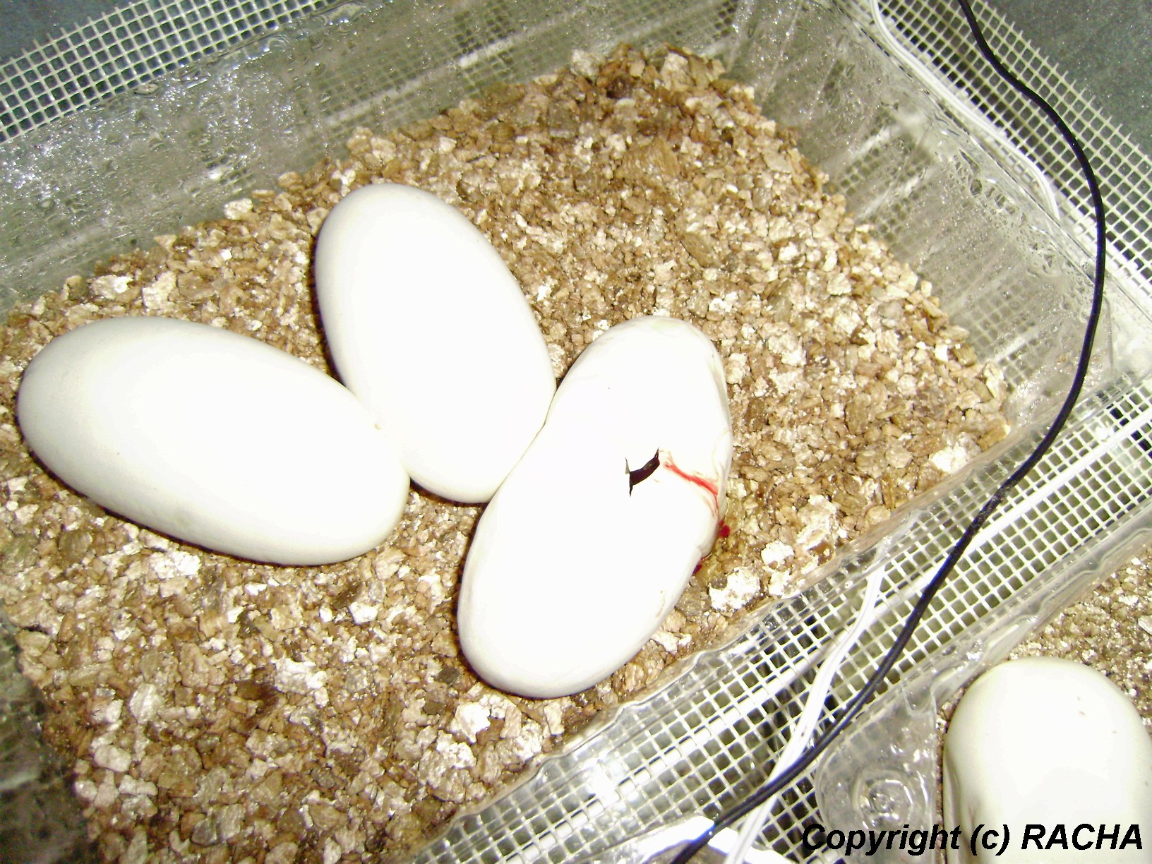 Dobrý postřeh, už jsem to psychicky nevydržel a dvě vejce nastřihl 68. den inkubace. Byla to nejdelší inkubace u krajt v mém chovu (70 dní), dosud nejdéle se inkubovaly breitensteinky 66 dní, kobercovky a maklotky většinou okolo 55 - 60 dní.