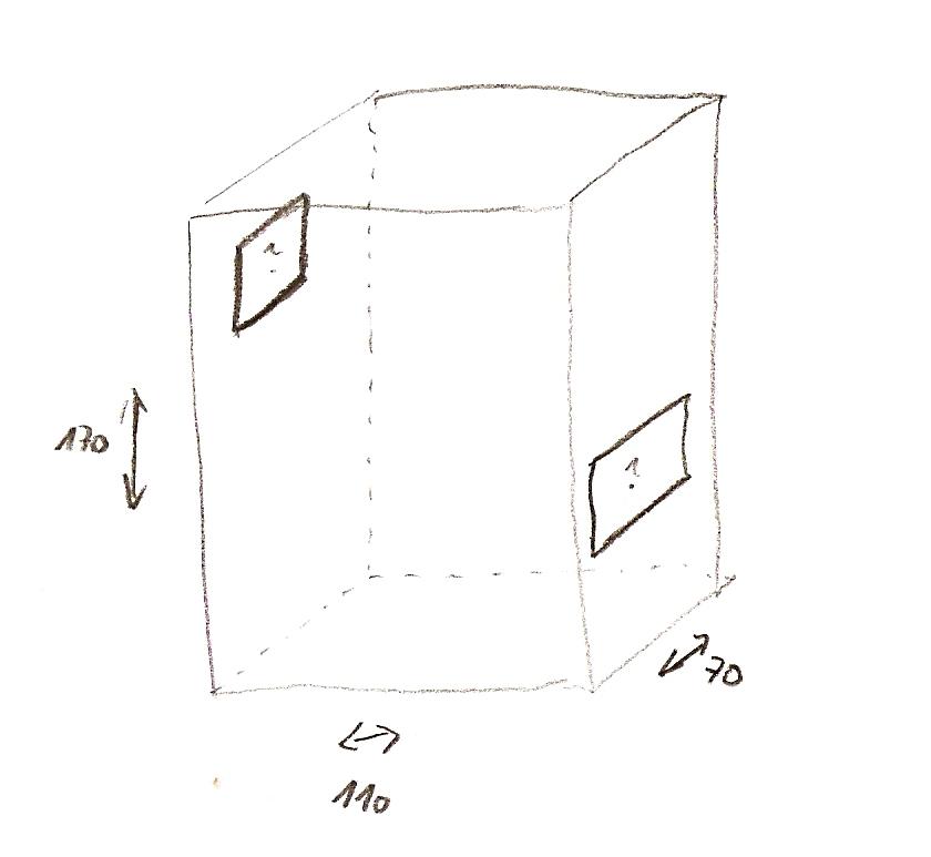 jo jo dávat větrací otvory na protější strany není dobrý nápad raděj na jednu stranu dolu a nahoru po případě dolu a do stropu ale rovněž nad spodní otvor a při této velikosti bych volil 30x 20 obě.