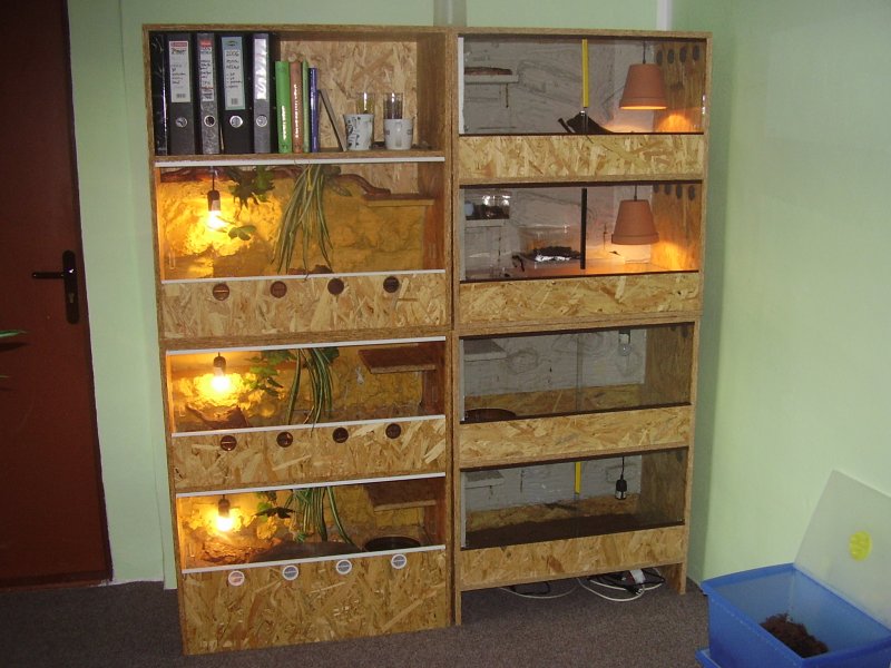 Na fotce pravá část je tvořena čtyřmi tarárii všechny o rozměrech 80x40x40cm. Tato stěna má velmi jednoduché pozadí z polystyrénu, který lze velmi snadno odstranit (přilepený silikonem) či dále podle potřeby tvarovat. Každé z terárií má uvnitř skleněnou vanu do výšky 7cm kvůli substrátu. Prodávám kompletně s elektroinstalací (žárovky, kable, digitální spínač) + 1ks sukulent. Dvířka jsou posuvná usazená v plastových kolejničkách. Větrání formou navrtaných dírek pod dvířky + po pravé straně formou ventilačních koleček. Tato sestava je v dobrém stavu používaná necelé dva roky. Cena 2000Kč.