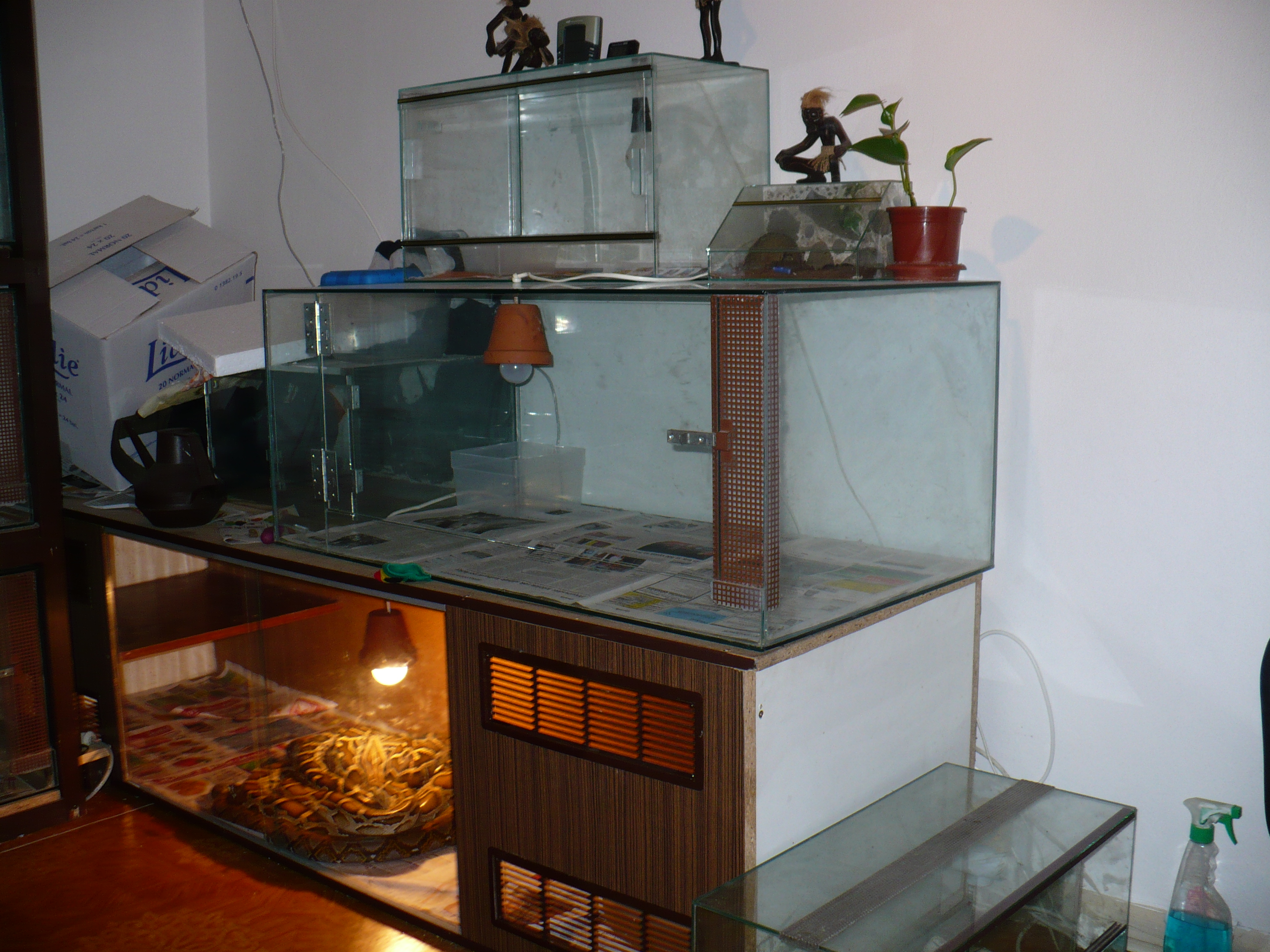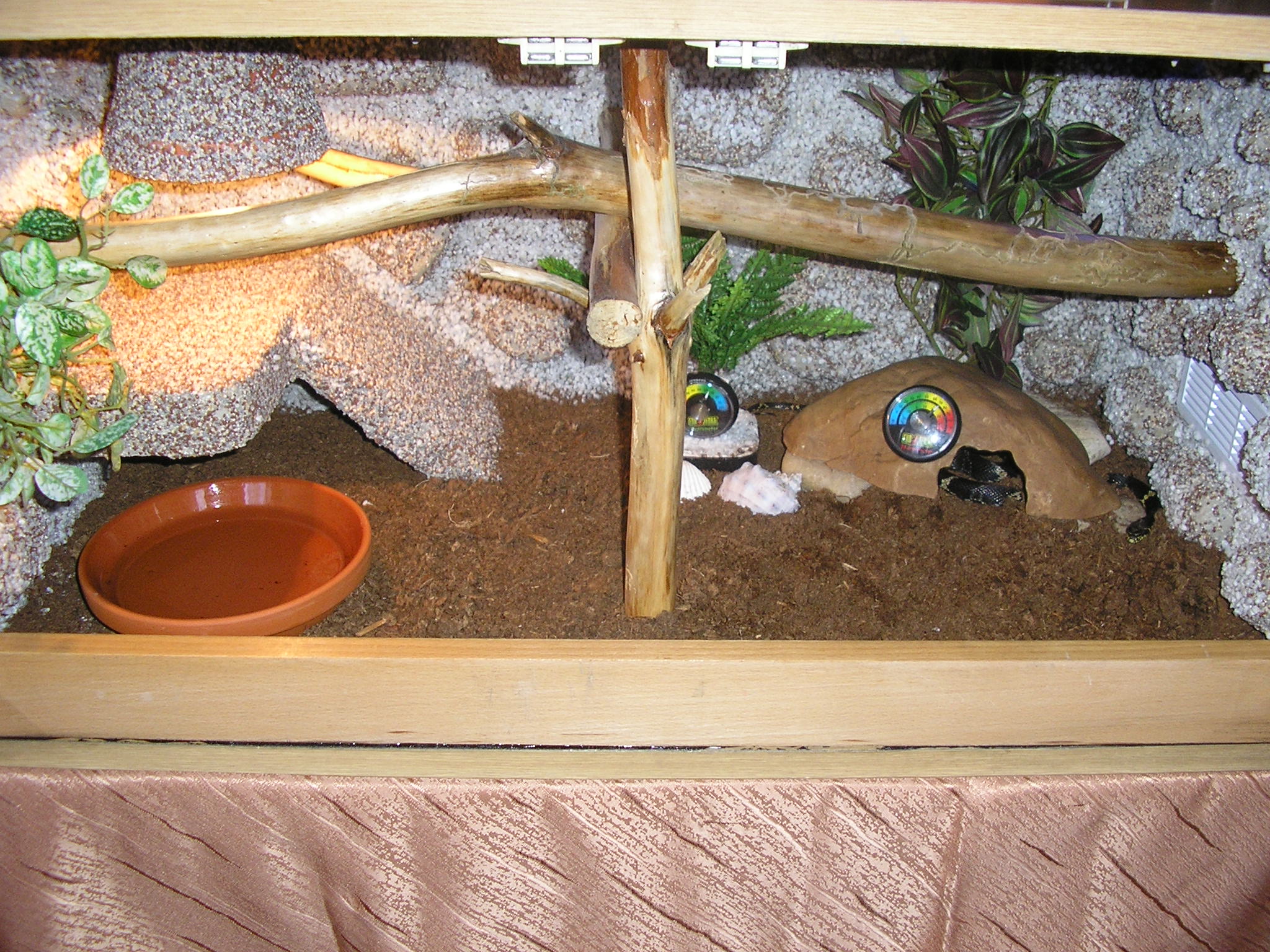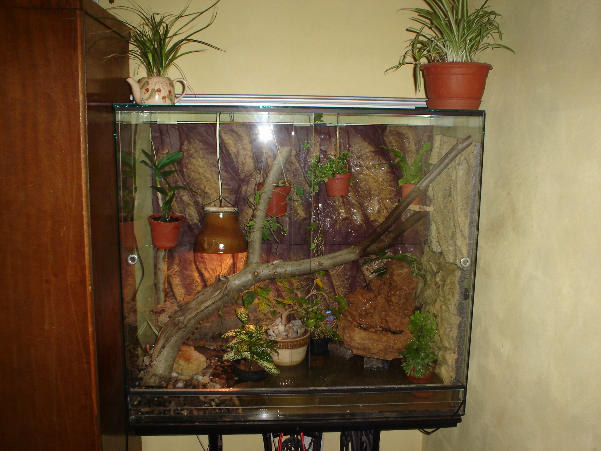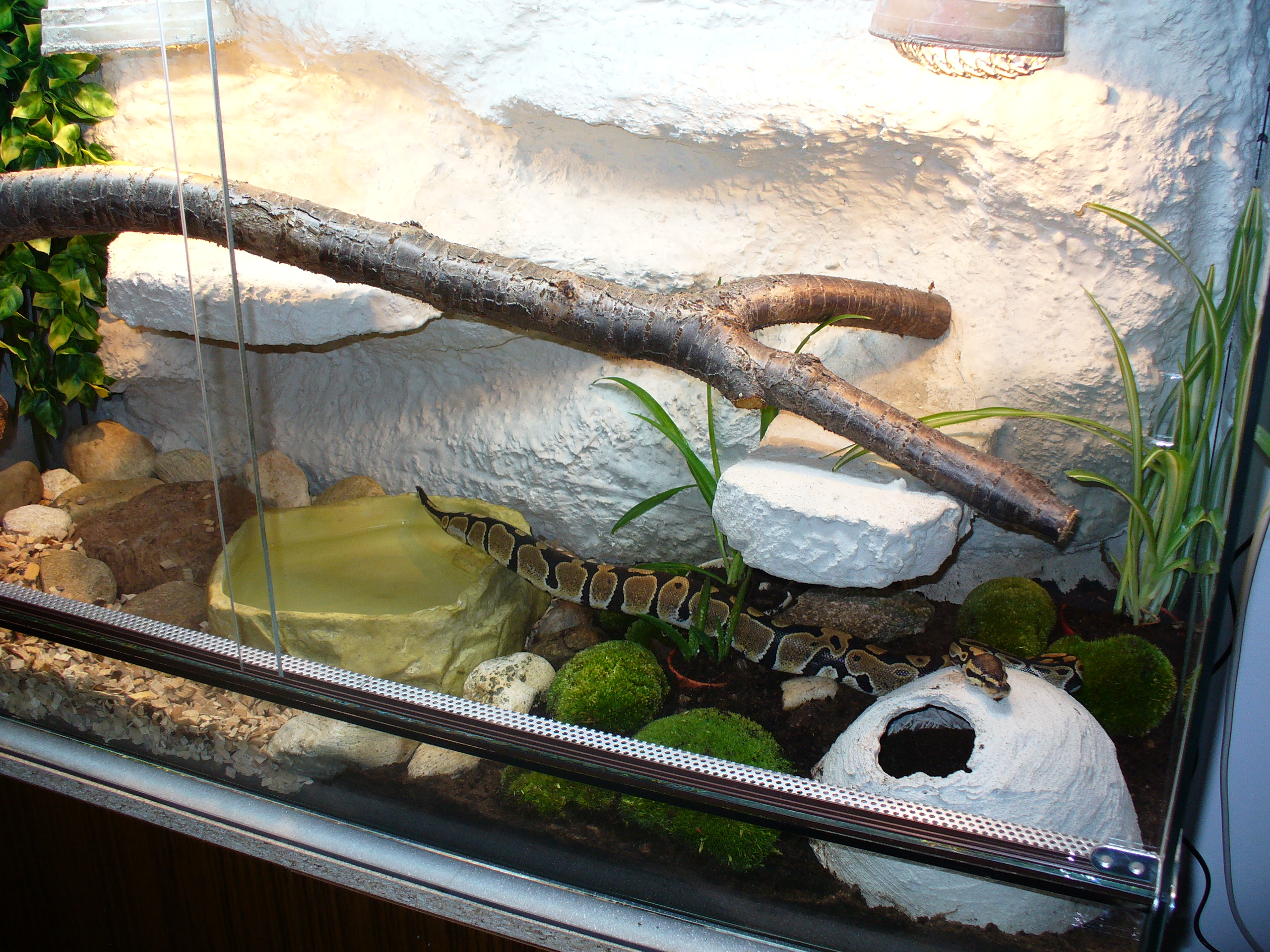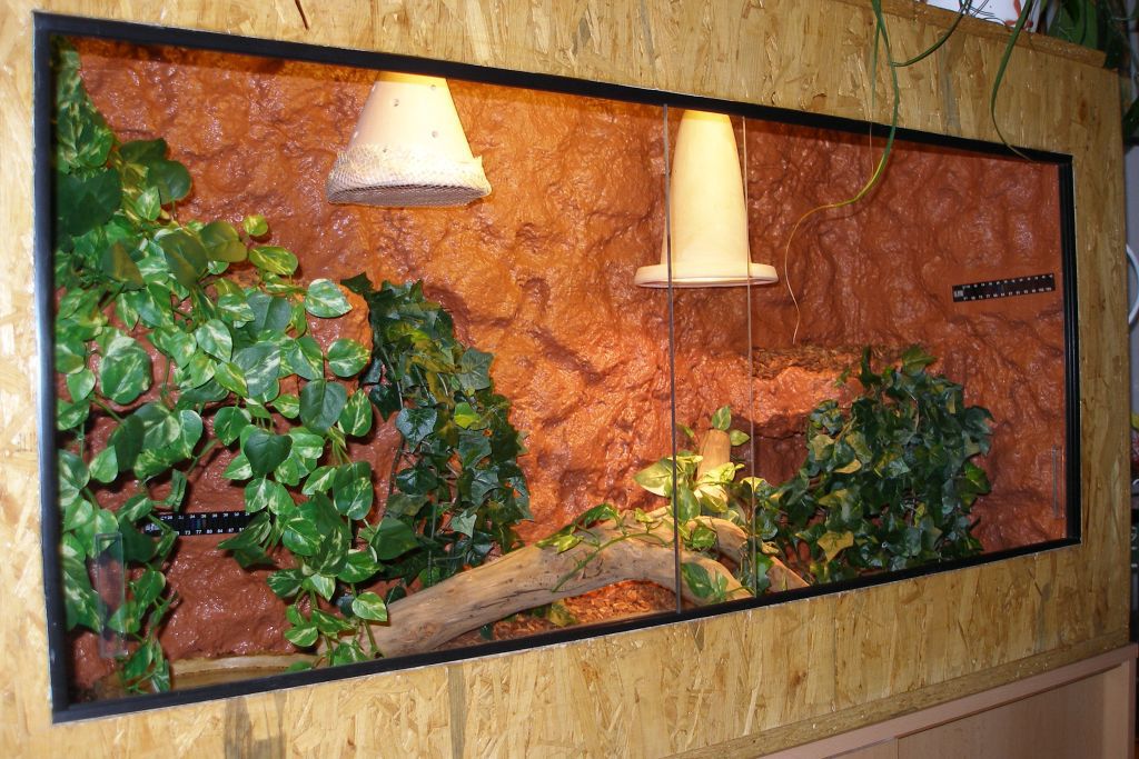 210x80x70 cm je tam jen 100W zarovka, topny kamen ktery na fotce neni a miska s vodou o rozmerech 50x40 cm :) pokud na burze bude raselinik, tak jeste pribude miska s raselinikem tot vse a obyvatele terka jsou 1,1 PMB samec cca 240 cm samice cca 350 cm a 0,1 Python reticulatus cca 300 cm ovsem budu delat terarium stejne velikosti nad todle pro samici reticulatky a pak jeste jedno stejnych rozmeru pro python sebae, ktery mam mit v kvetnu... Co se tyka terarii pro dospelce tak ty planuju 250x100x80 cm ovem az zvirata prerostou delku 4m