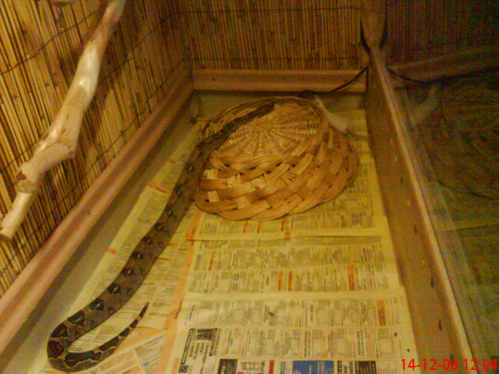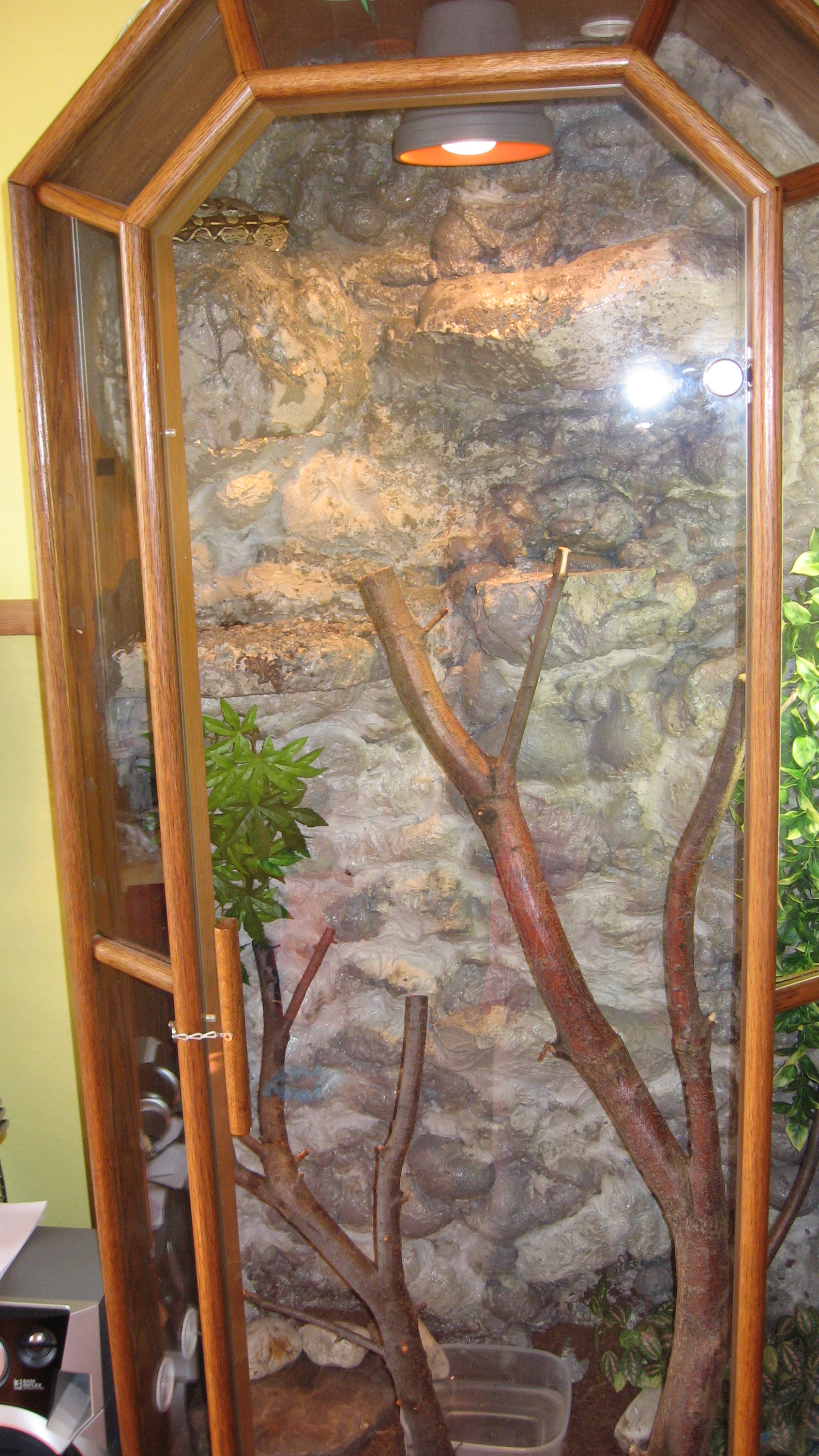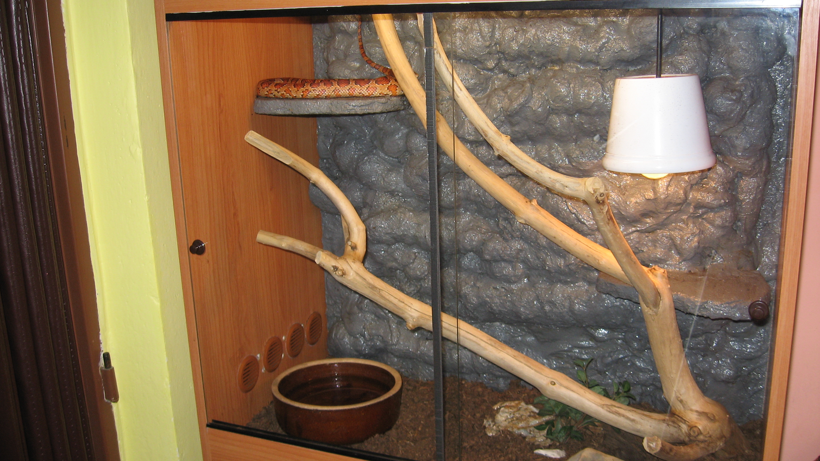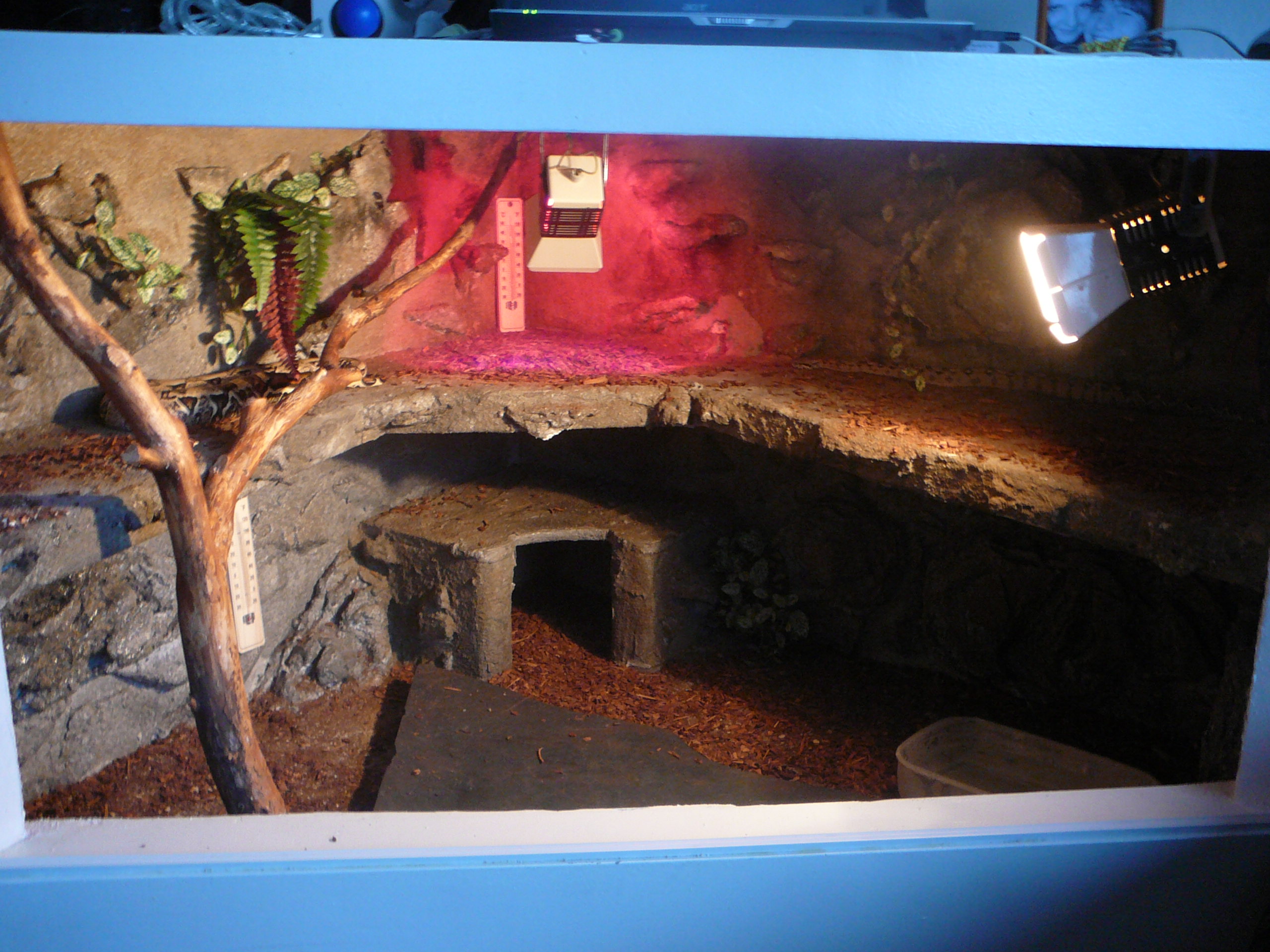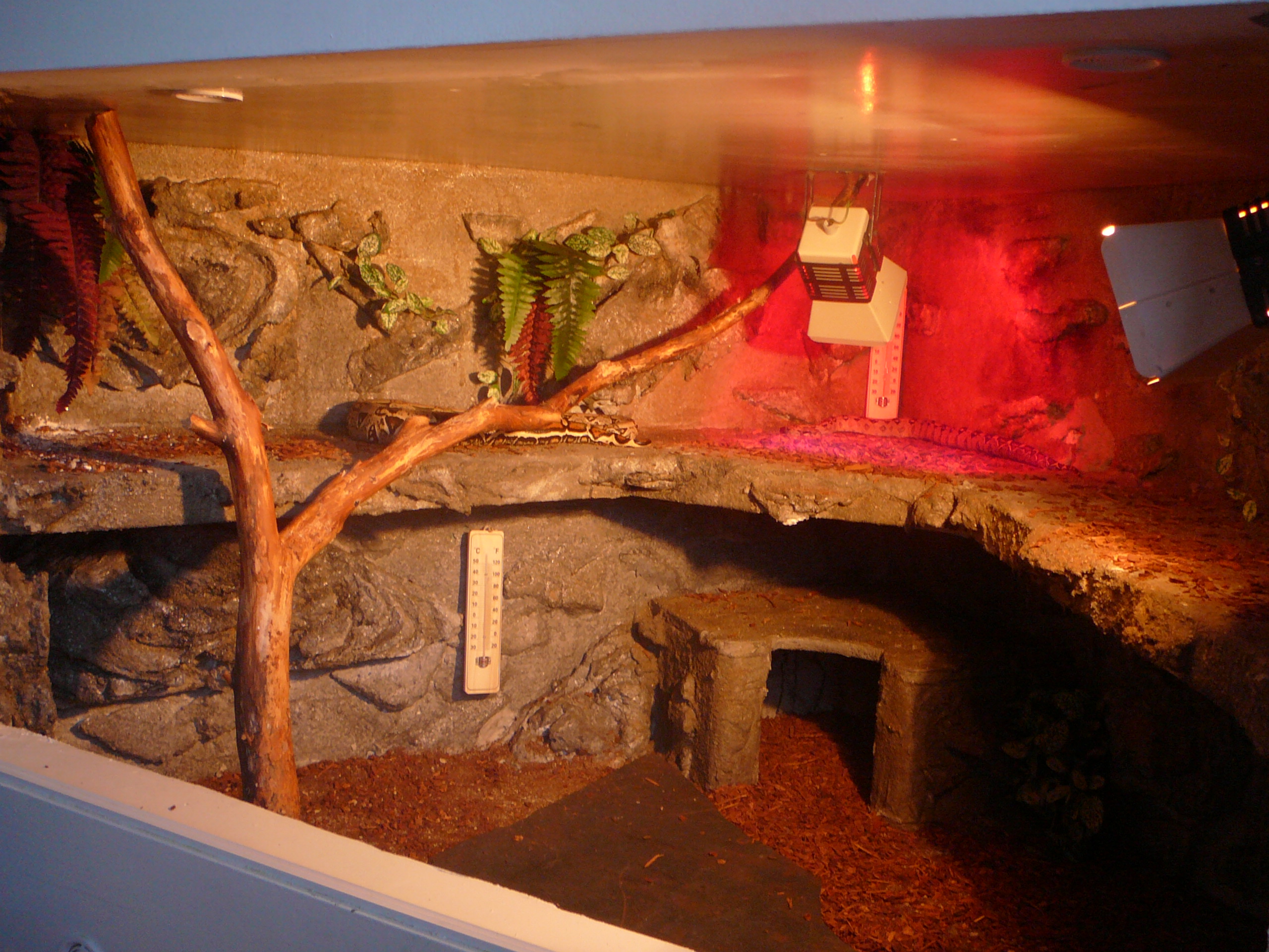 210x80x70 cm je tam jen 100W zarovka, topny kamen ktery na fotce neni a miska s vodou o rozmerech 50x40 cm :) pokud na burze bude raselinik, tak jeste pribude miska s raselinikem tot vse a obyvatele terka jsou 1,1 PMB samec cca 240 cm samice cca 350 cm a 0,1 Python reticulatus cca 300 cm ovsem budu delat terarium stejne velikosti nad todle pro samici reticulatky a pak jeste jedno stejnych rozmeru pro python sebae, ktery mam mit v kvetnu... Co se tyka terarii pro dospelce tak ty planuju 250x100x80 cm ovem az zvirata prerostou delku 4m