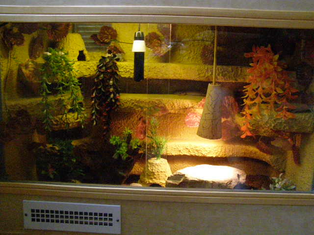 Terárko pro Mášenku... 1) z toho zrdcadla musí mít radost 2) topení nevidím 3) domečky taky fajn 4) a o tom že musí lézt po skleněný polici ani nemluvim 5) Chudák Mášenka