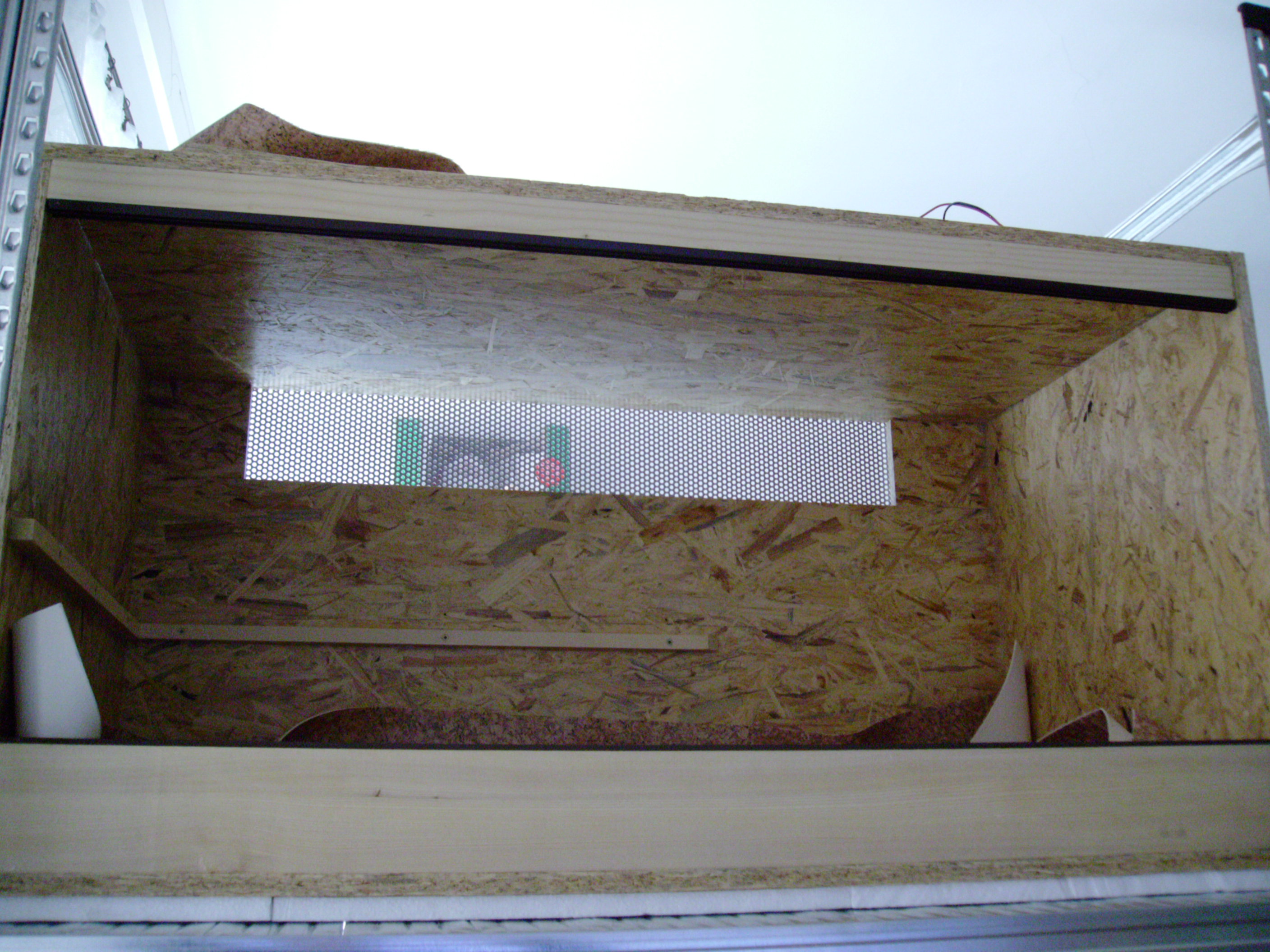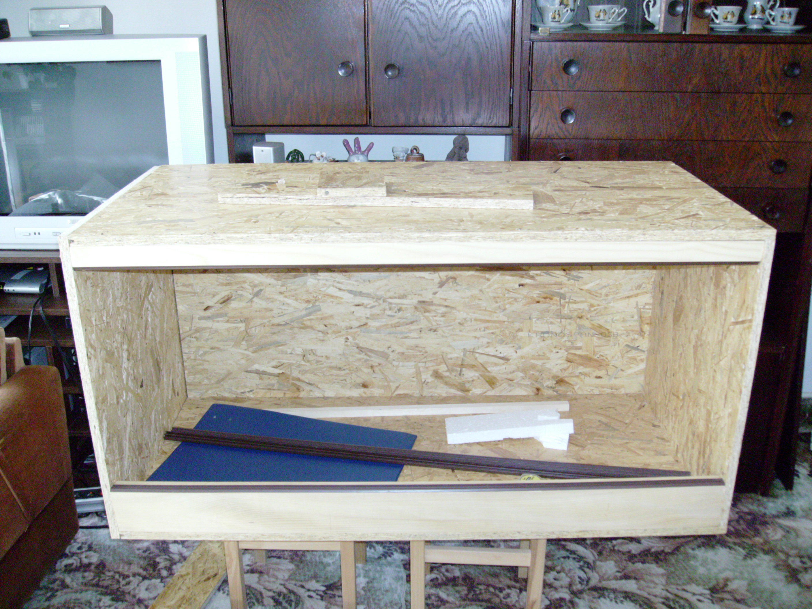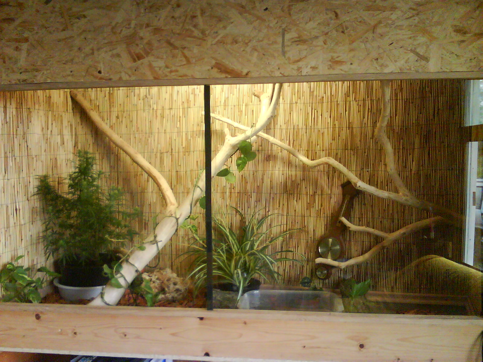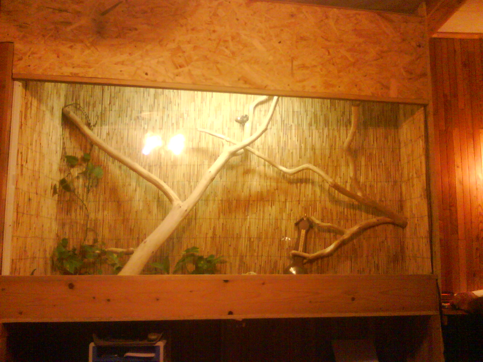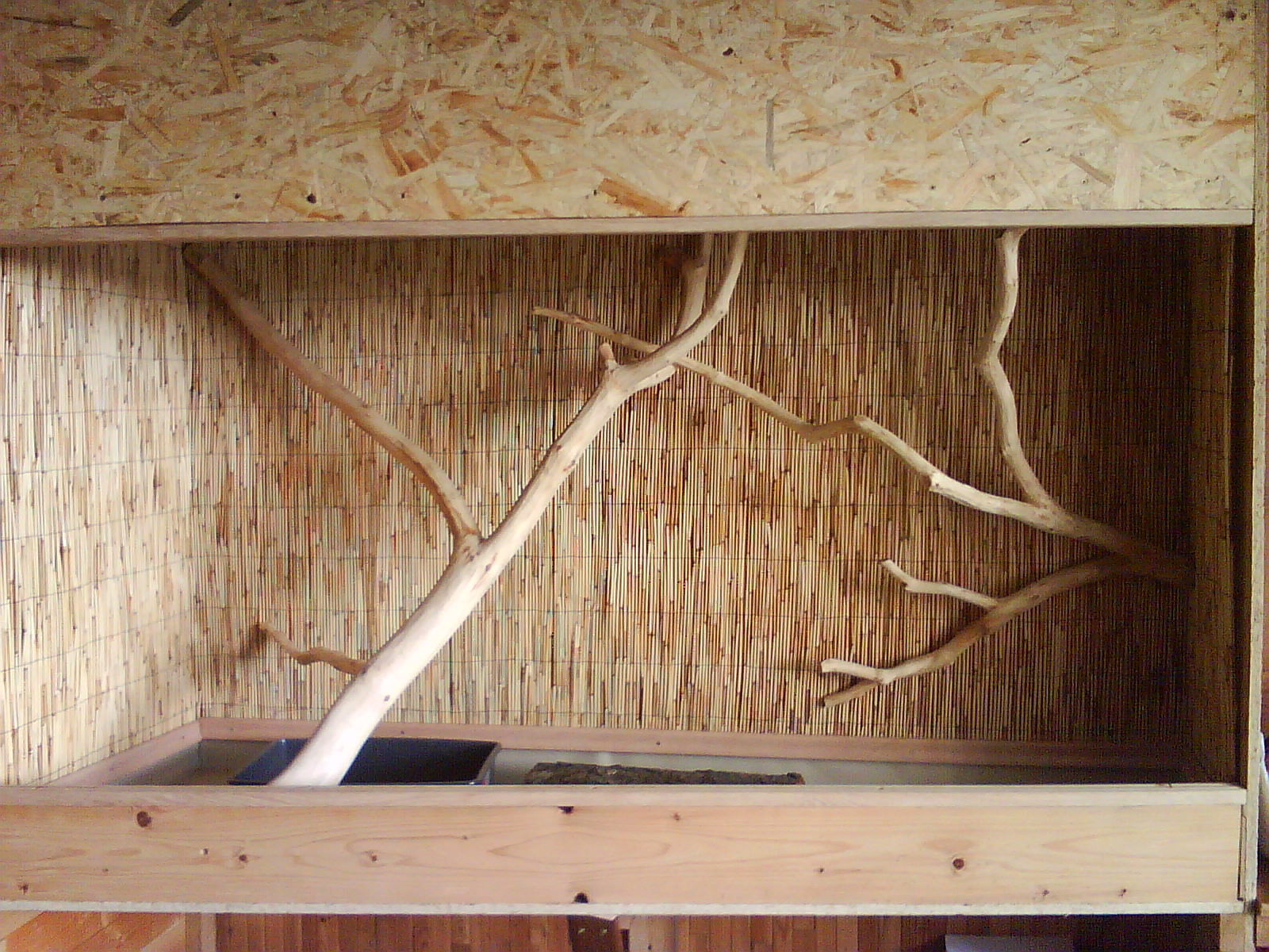 No mě spíše už malá rozvodová skříň.Je to takhle jen prozatím,než vše dodělám a pak se i elektrika uschová do temnějších koutů.Ty OSB jsou již naimpregnované,takže pro hady,co nemusím tolik rosit dále již nelakuji.Pro hady,které rosím denně,tak natírám 2ma vrstvama matného bezbarvého laku.Zatím vše ok.Já jsem dříve stavěl z lamina,ale po zkoušce OSB už nechci jinak(teda pokud časem nebude ještě nějaké nemilé překvapení).Je to finančně celkem nenákladné(oproti laminu) a vzhledově se mi též celkem líbí.A hlavně je paráda,že je celkem jednoduché uchytit větve,s čímž jsem měl u skleněných terárií celkem problem. Karel(SNBák)No tak nebuď lenoch a dojeď.
