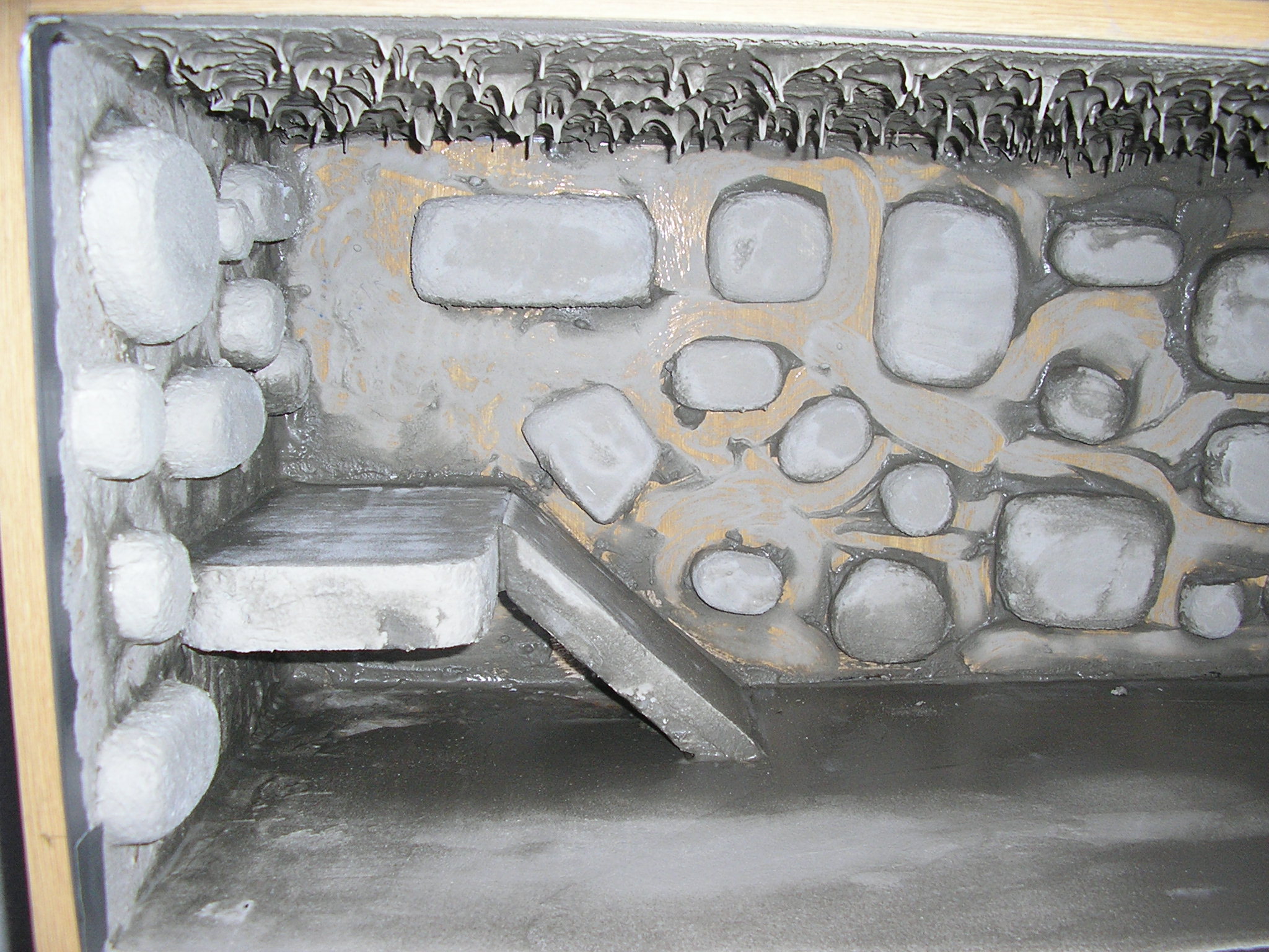 Klasika...pozadi je s polystyrenu a montazni peny. Natreno nekolika vrstvama lepidlem na kachlicky. Jemne osterkovana a opiskovano..natreno matnym lakem s atestem na hracky a potraviny.