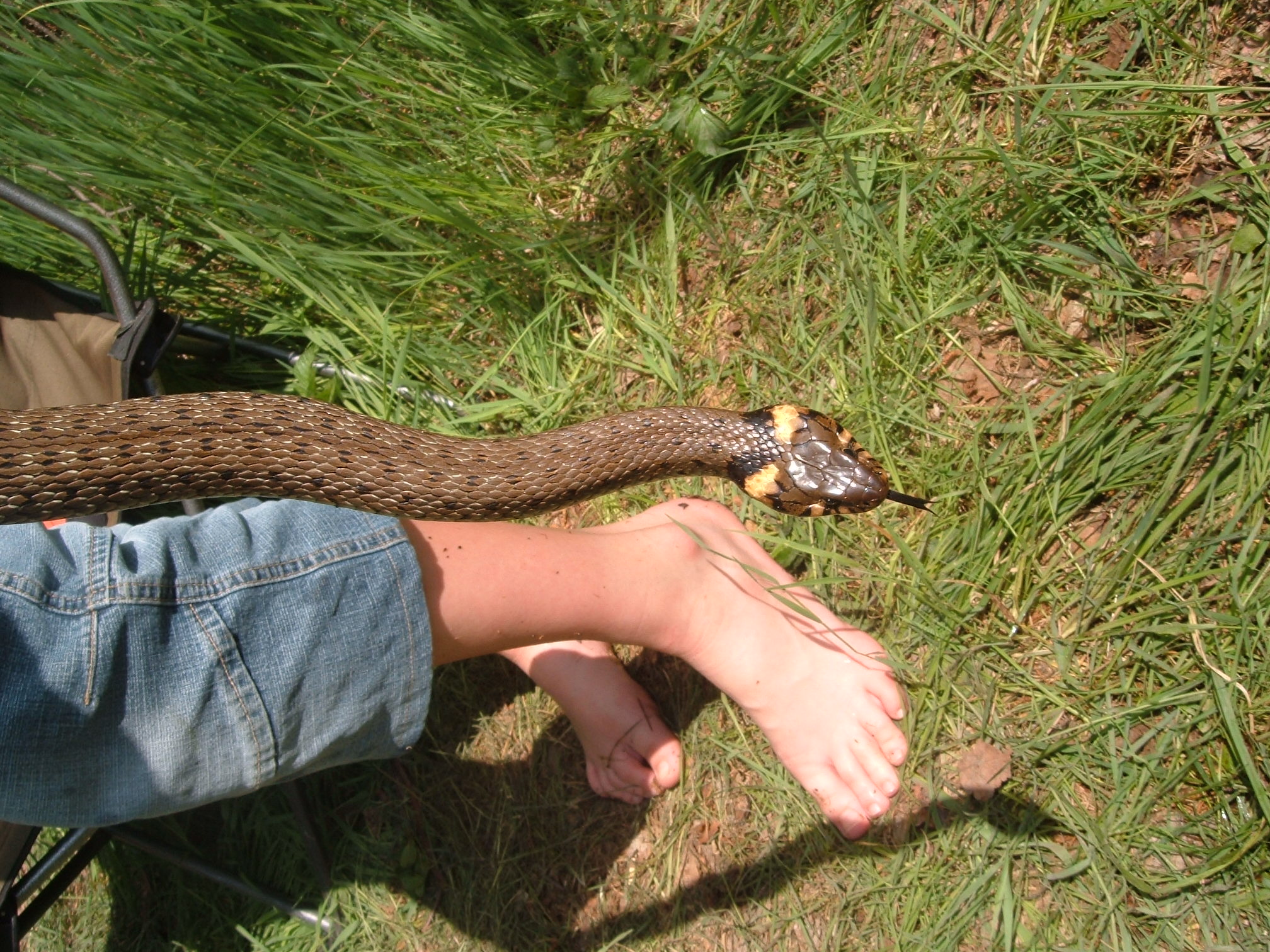 No já jsem minulý rok na jaře chytil taky užovku obojkovou a ta byl taky docela velká ale bohužel mám špatné foto jen vedle mé nohy . Já myslím že měla tak 130cm.