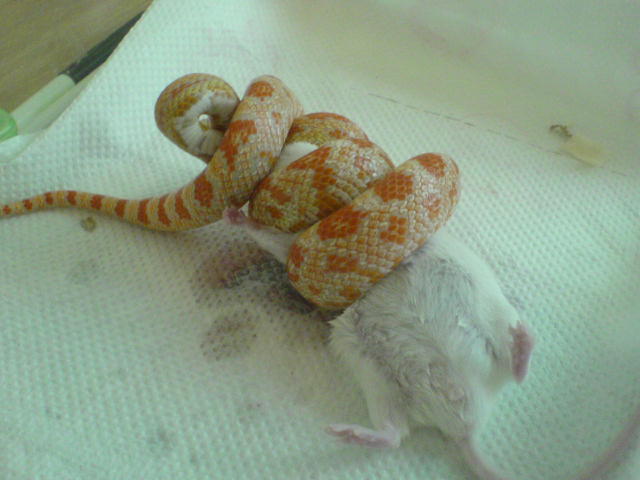 No, tak to bych taky neviděl jako nejlepší. Když vidím veliksot myší ve zverimexech tak jedna opravdu nestačí. Na 14 dnů dávám chovným guttatam 2 potkany.