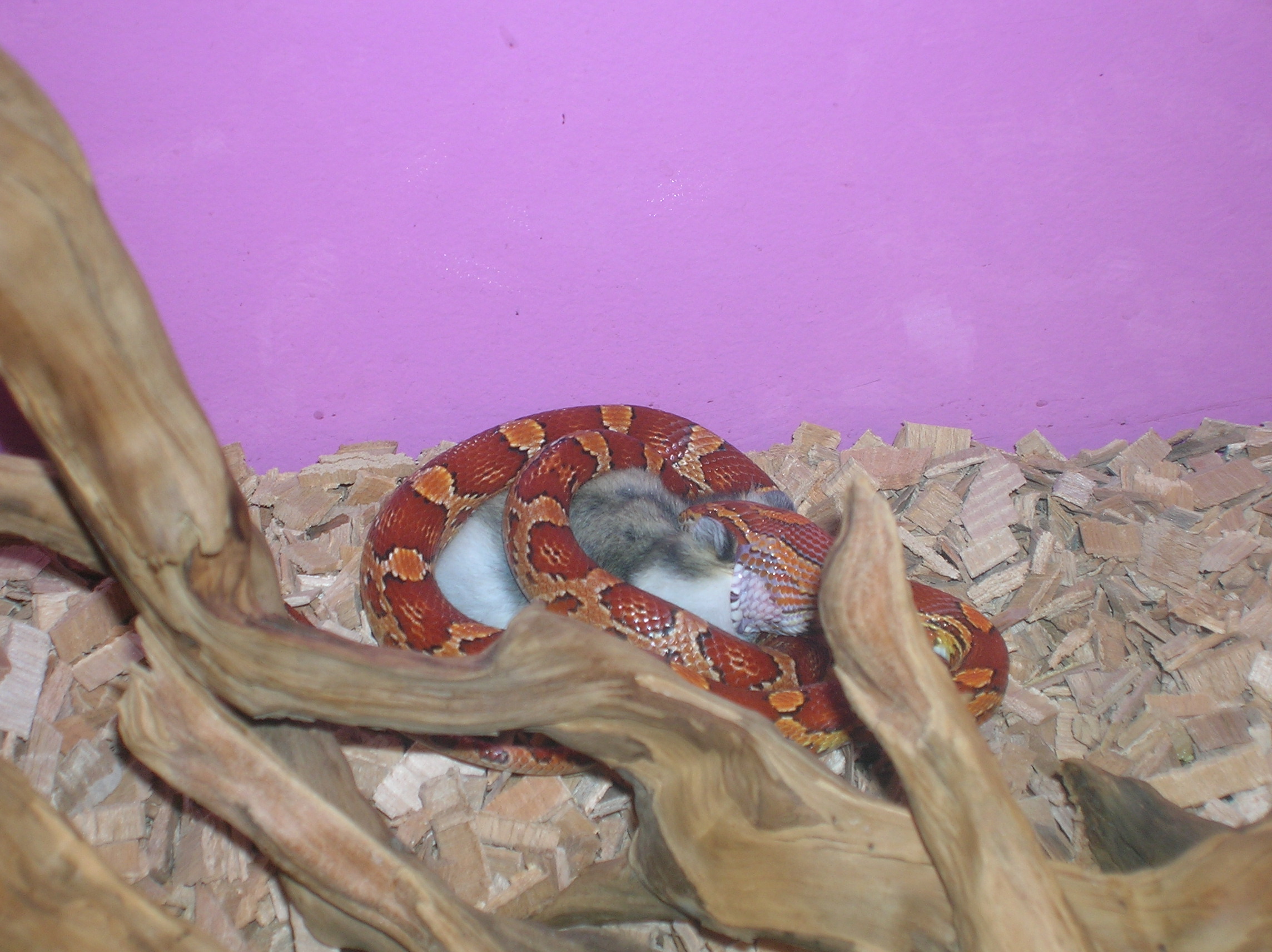 Tahle malá užovka zvládne malého křečka, pak mám stejně velkou korálovku mexickou a ta bere taky už myšky..No a užovka (115cm) mi vezme i 3 malé myšky týdně, ale musím ubrat protože mi tloustne