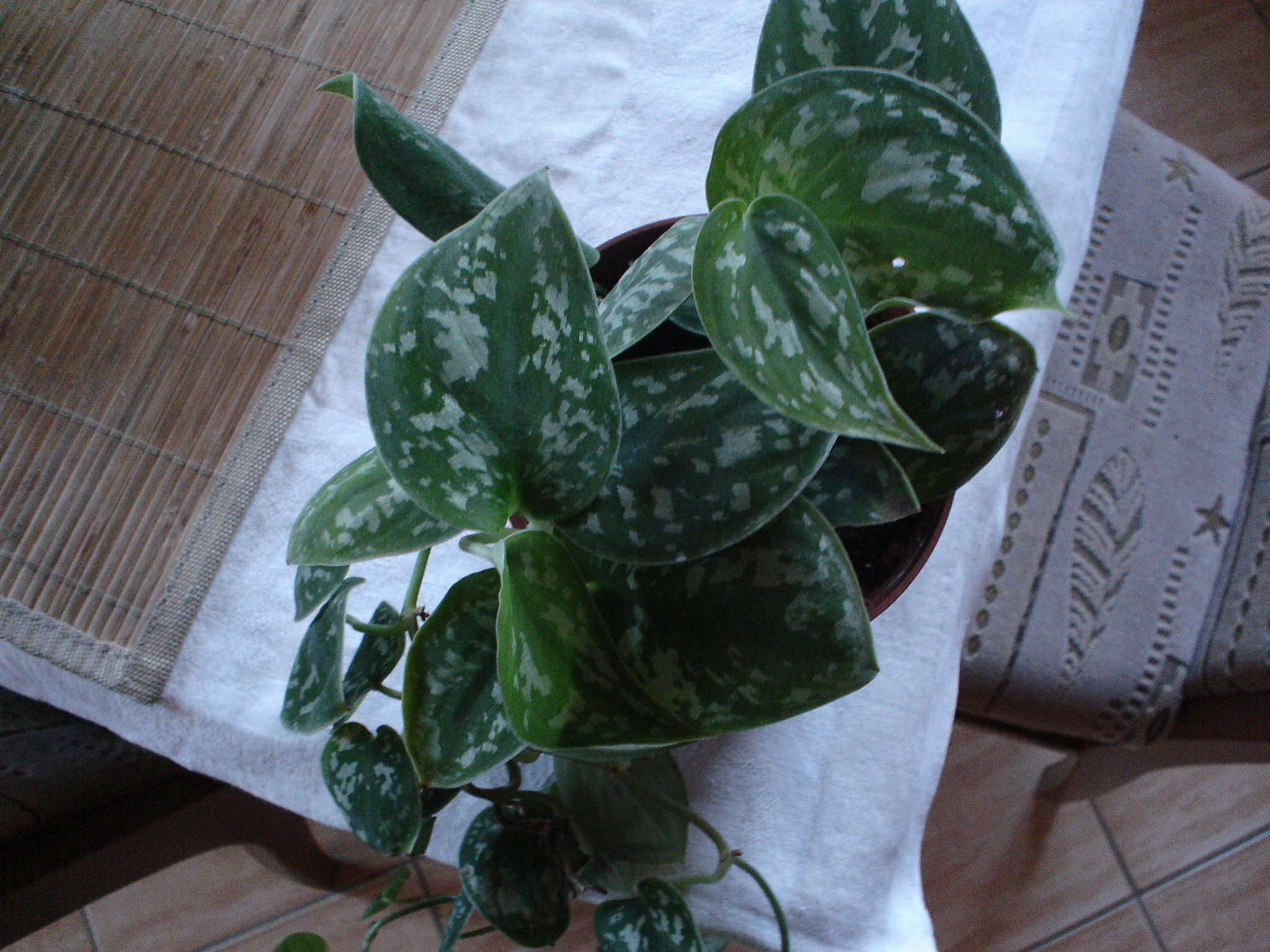 Jde o rostlinu z čeledi áronovitých Scindapsus pictus, která je opravdu blízce příbuzná potosu - někteří autoři je dokonce zařazují do stejného rodu, jiní nikoliv. Jde o velice vhodné kytky do terárka, které jsou velice nenáročné i na intenzitu světla a rychle rostoucí. Bohužel pro člověka je tento druh jedovatý, takže nevím jak je to u agam, na druhou stranu se s ním mohou běžně setkat v přírodě, takže věřím, že pokud je pro ně jedovatý neměly by ho požírat...