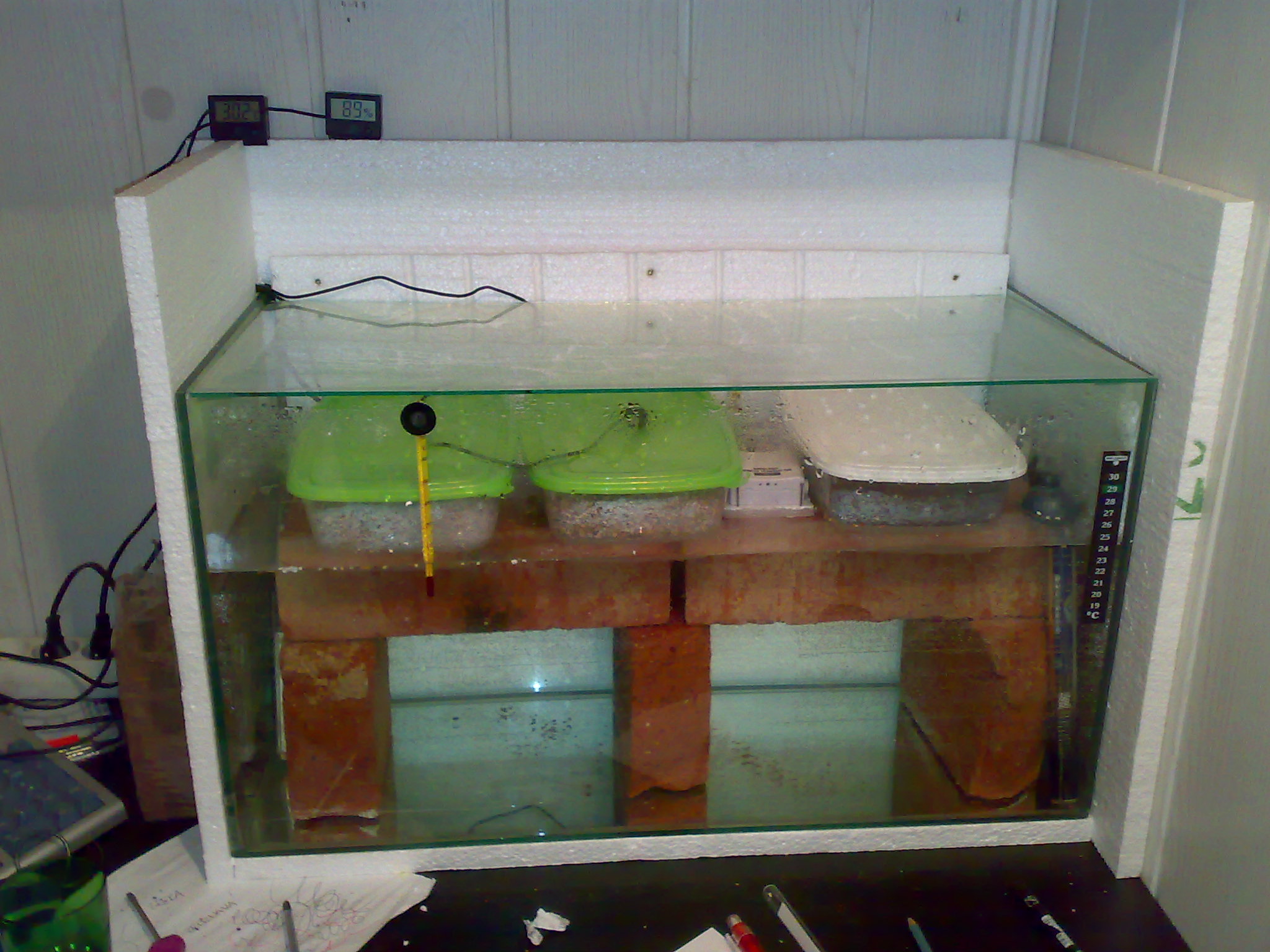 Největší problém je kapání vody na vejce, to je spolehlivě zabíje a nic neuděláš. Dobré je místo klasických vík na ty dózy udělat nějaké stříšky z plastu. Další (pracná) možnost je pod vrchní sklo dát plenu a tu pravidelně měnit (ždímat), další možnost šikmé vrchní sklo (viz. Mad Mike), další možnost - slabší topný kabel na vrchním skle (ze spoda) zabraňuje kondenzaci vody.
