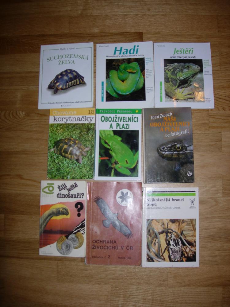 Knihy: Bydli s nami suchozemská želva 30Kč, Hadi 45Kč, Ještěři 50Kč, Chováme korytnačky 45Kč, Obojživelníci a plazi 130Kč (všechny Evropské druhy-mnoho barevných fotografií a mapky rozsireni, rozlepená vazba), Naši obojživelníci a plazi ve fotografii- Zwach 70Kč, Žijí ještě dinosauři? 25Kč, Ochrana živočichů v ČR 30Kč, Nejkrásnější brouci tropů 30Kč.