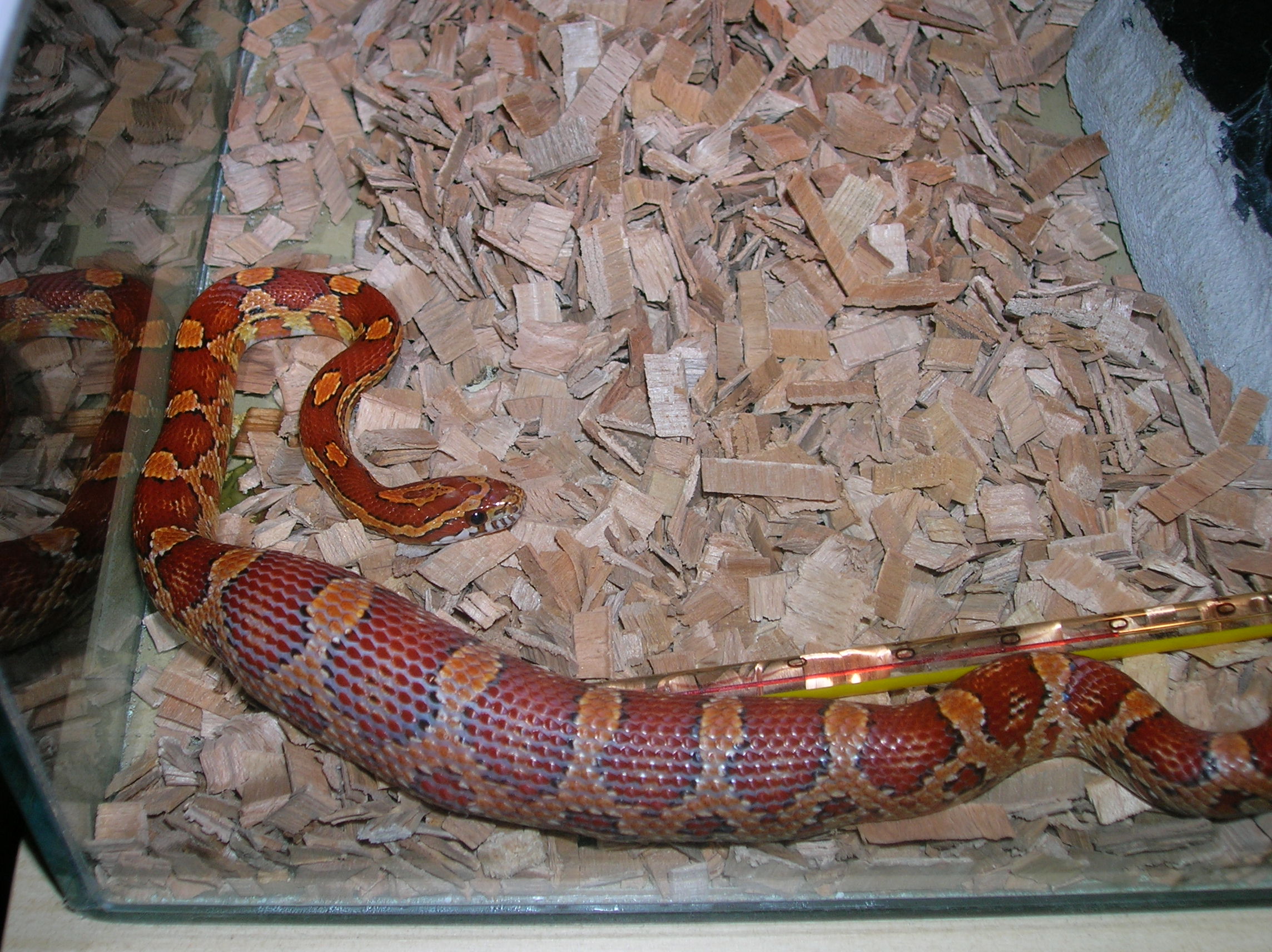 Prodám užovku červenou i steráriem terarko 100x50x50 dřevěné posuvné přední skla pozadí tvarovaný polistyren užovka cca 150cm měl by to být samec ale jistý si nejsem.
