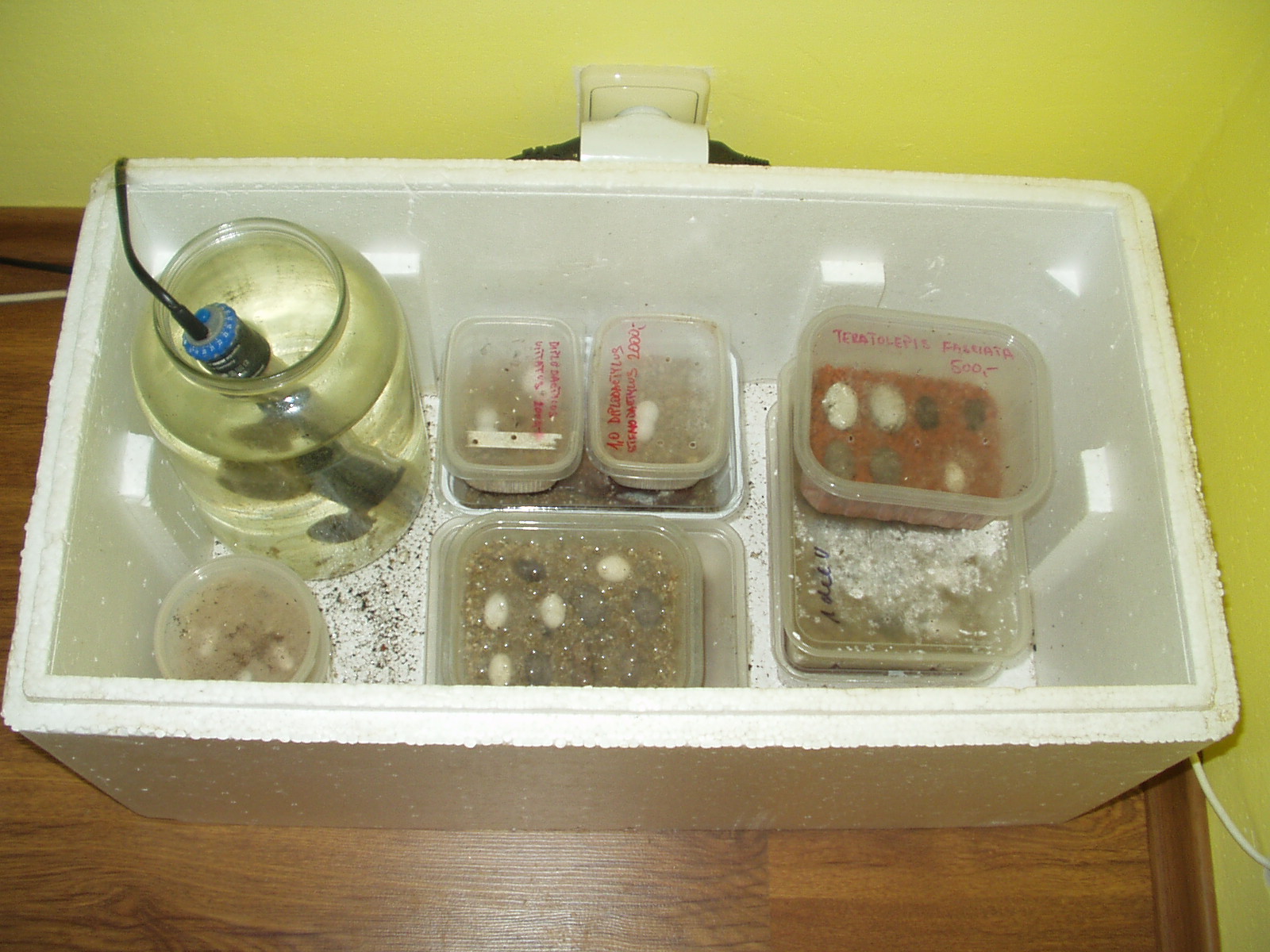 Na gekončíky nepotřebuješ nic speciálního.Pro všechny gekony používám jednoduchý inkubátor.V polysterenové krabici je třílitrová flaška s vodou a v ní akvarijní topítko s termostatem.Cenově se vejdeš do pětistovky a hotový je za 5 minut.Vejce jsou v krabičkách na vermikulitu nebo seramisu.Inkubuju v tom vejce všech gekonů(Diplodactylus,Phelsuma,Rhacodactylus,atd..)