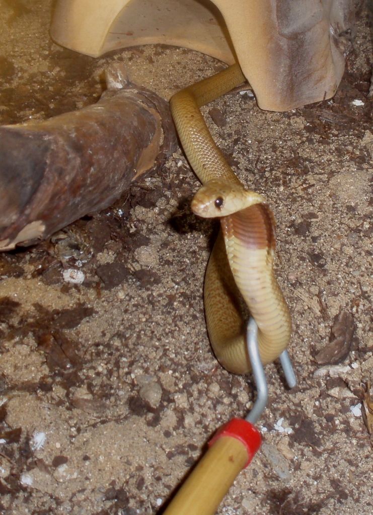 Ale jo je celkem v pohode, z terka ji bylo potreba zatim vytahovat jen 2x,pri manipulaci mimo terko je celkem divoka ... jinak pokud neni hladova bejva predevsim v budce jen parkrat za den vyleza na "obhlidku teritoria" takze udrzba teraria je celkem pohodova ... ani se uz nejak moc neplasi pri otevreni terka zustava lezet, obcas pozvedne hlavu aby okoukla co se to vlastne kolem ni deje ... oproti krajtam nebo zmijim jsem pozoroval znacnou "inteligenci" dokonce mam takove tuseni ze rozpozna chovatele ... ale to je jen domenka, jelikoz kdyz chodim po mistnosti nebo tak jen ja tak v pohode ale jak prijde nekdo jiny tak predvadi svuj postoj ale jak rikam asi je to jen domenka ... za tu dobu co ji mam cca 3 mesice se jiz 3x svlekala, krmim odstavenymi potkany cca 2 ks 1x-2x za 14 dni zda se ze ji to vyhovuje, respektive krmim vzdy kdyz na ni vidim ze by si dala... tot asi vse jeste k tem ukrytum tady jsou nejaky fotky mam tam obyc ptaci drevenou budku s raselinikem + keramicky ukryt s plastovym uchem pro snadne zvedani hakem viz foto PS: kdo bude hledat misku na vodu tak ta tam pri foceni nebyla ... byva na miste kde je hadek na druhe fotce