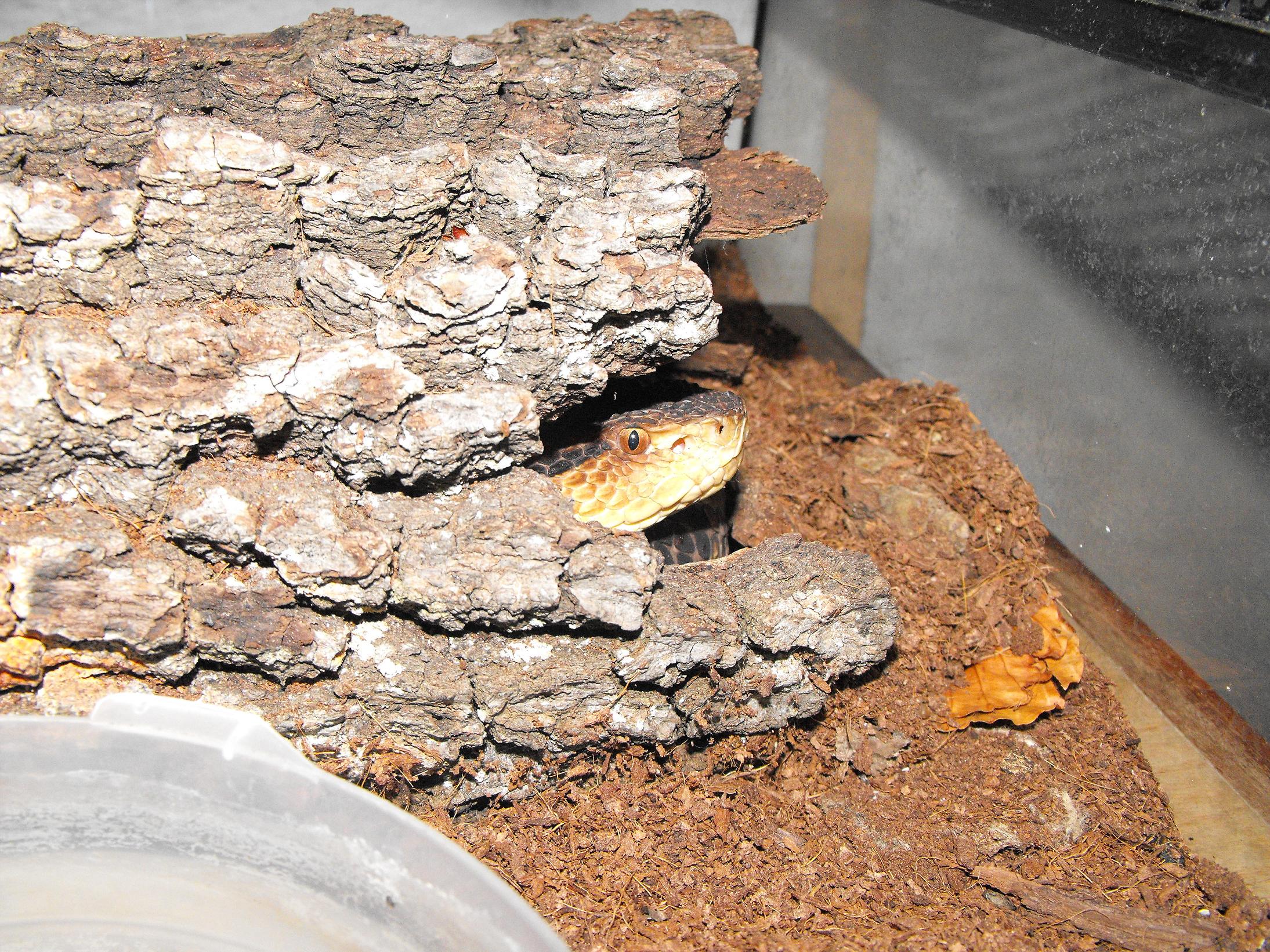 Ale jo je celkem v pohode, z terka ji bylo potreba zatim vytahovat jen 2x,pri manipulaci mimo terko je celkem divoka ... jinak pokud neni hladova bejva predevsim v budce jen parkrat za den vyleza na "obhlidku teritoria" takze udrzba teraria je celkem pohodova ... ani se uz nejak moc neplasi pri otevreni terka zustava lezet, obcas pozvedne hlavu aby okoukla co se to vlastne kolem ni deje ... oproti krajtam nebo zmijim jsem pozoroval znacnou "inteligenci" dokonce mam takove tuseni ze rozpozna chovatele ... ale to je jen domenka, jelikoz kdyz chodim po mistnosti nebo tak jen ja tak v pohode ale jak prijde nekdo jiny tak predvadi svuj postoj ale jak rikam asi je to jen domenka ... za tu dobu co ji mam cca 3 mesice se jiz 3x svlekala, krmim odstavenymi potkany cca 2 ks 1x-2x za 14 dni zda se ze ji to vyhovuje, respektive krmim vzdy kdyz na ni vidim ze by si dala... tot asi vse jeste k tem ukrytum tady jsou nejaky fotky mam tam obyc ptaci drevenou budku s raselinikem + keramicky ukryt s plastovym uchem pro snadne zvedani hakem viz foto PS: kdo bude hledat misku na vodu tak ta tam pri foceni nebyla ... byva na miste kde je hadek na druhe fotce