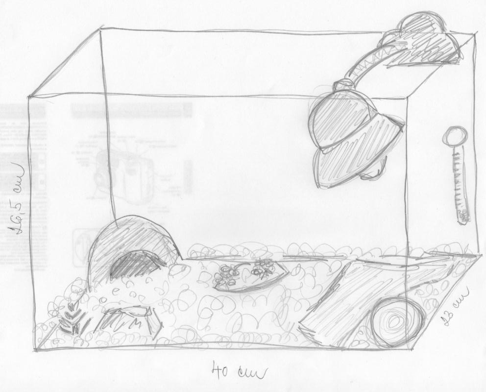 Bohužel momentálně nemohu pořídit fotky ( jsem bez foťáku), ale pokusila jsem se terárium ( akvárium ) nakreslit. Nelekejte se malých rozměrů, čekáme na větší terárko (40 x 70) a jinak běháme po bytě, zatím, než bude tepleji.