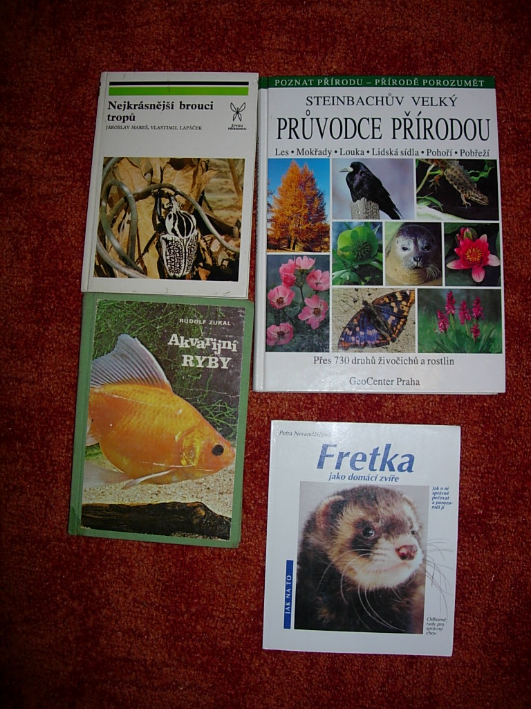 Knihy o přírodě prodám: Steinbachův velký průvodce přírodou 200Kč (celobarevná pěkná kniha), Akvarijni ryby-Zukal 10Kč (chybí pár listů fotog.přílohy), Nejkrasnejsi brouci tropu 20Kč, Jak na to-fretka 60Kč.