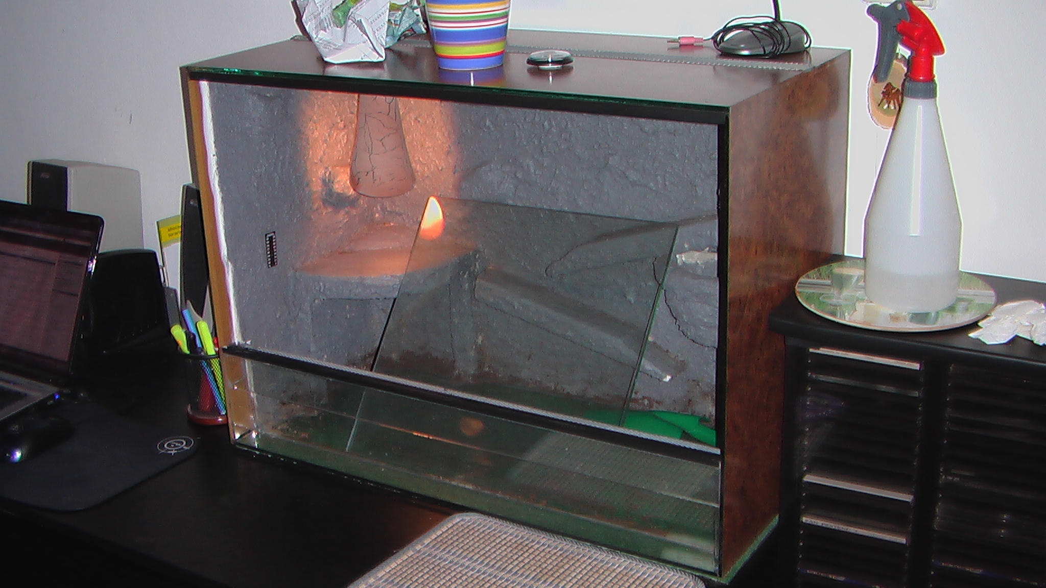 Prodám celoskleněné terárium 70 x 35 x 50 (d,š,v), včetně 40W SunGlo + keram. kryt; 3D pozadí z polystyrenu; terárium je polepeno hnědou tapetou, posuvná dvířka, dvojité větrání (nahoře a vepředu-dole). Cena dohodou v e-mailu. Kontakt: mkubale@seznam.cz