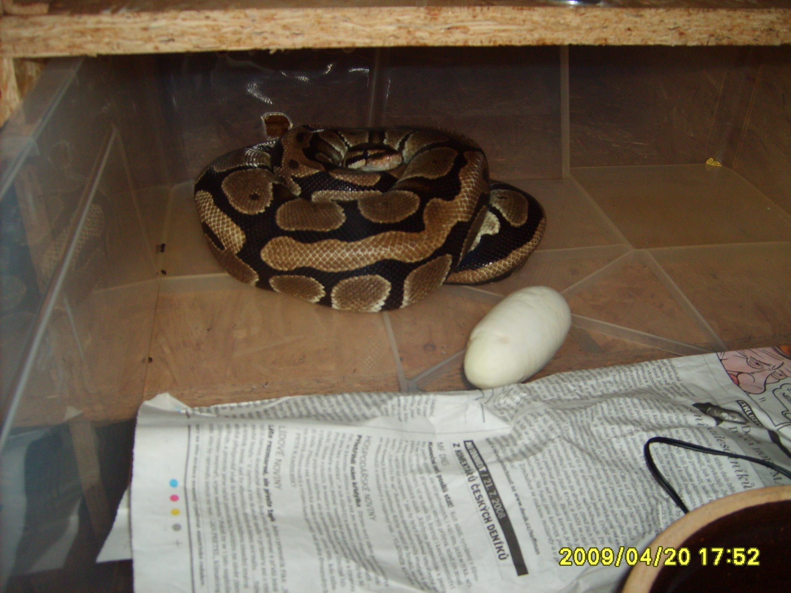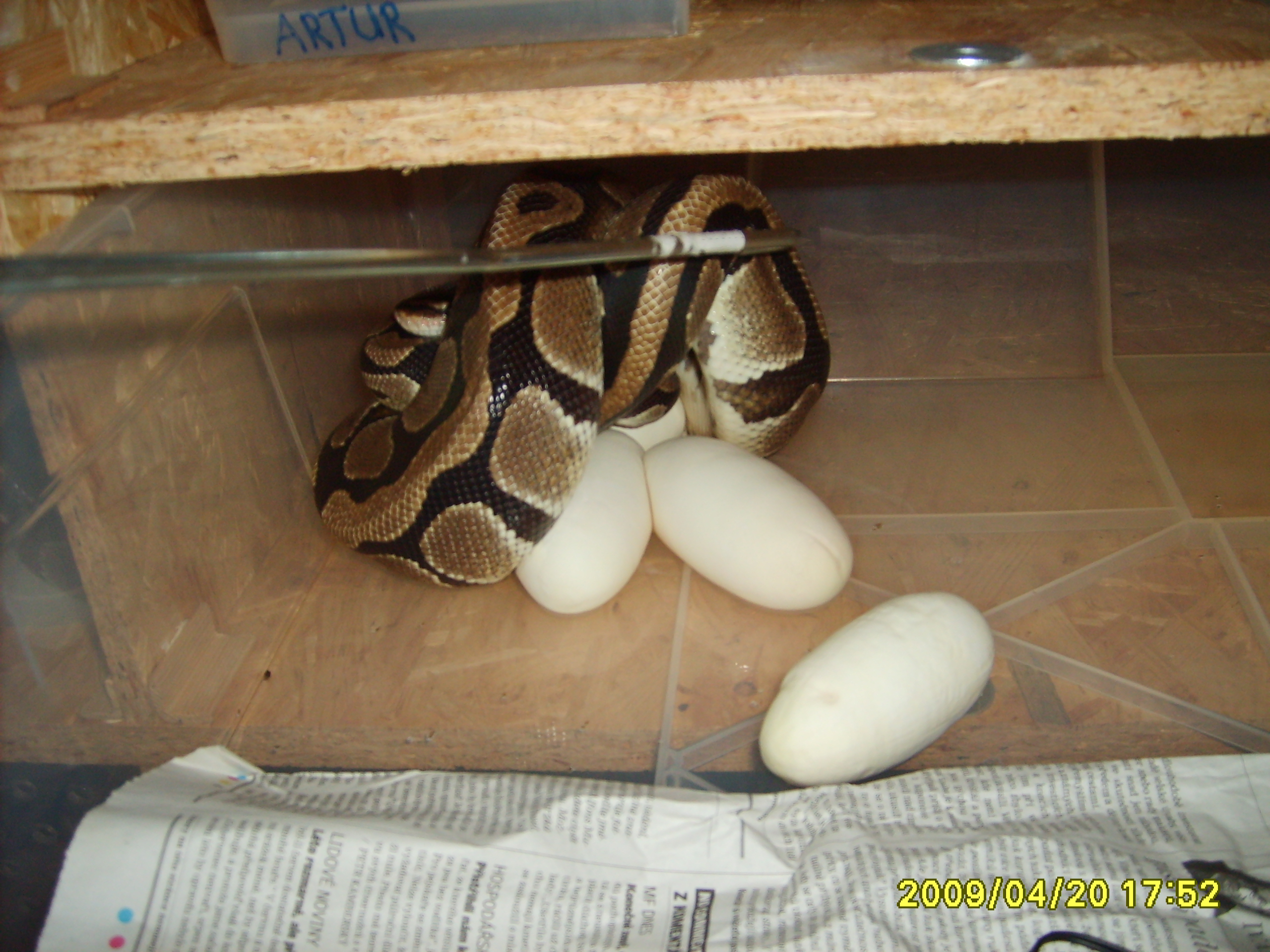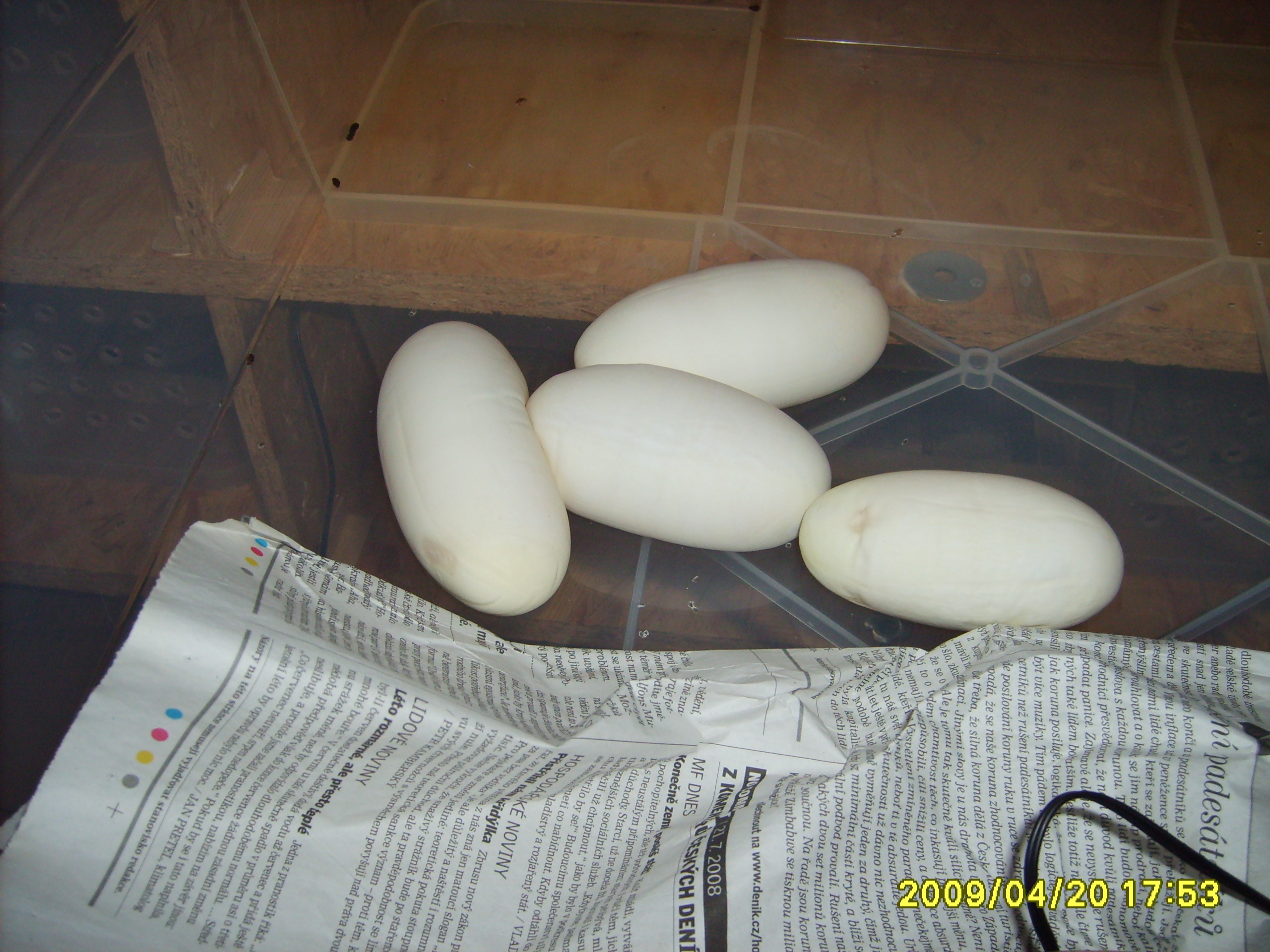 ) moluruska na vejce (počet přesně nevím, ale asi tak okolo 20 ks), vylíhly se tři Timon tangitanus - j. perlová (celkem 9 z 10 vajec) a začli se líhnout C. sulcata - ž. ostruhatá (první 3, dneska už 5 z celkem 21 vajec) a každým dnem by měla snést samice Varanus panoptes hornii (podle sona by jich tam mohlo být 8+). Takže slušné. Foto dodám později.