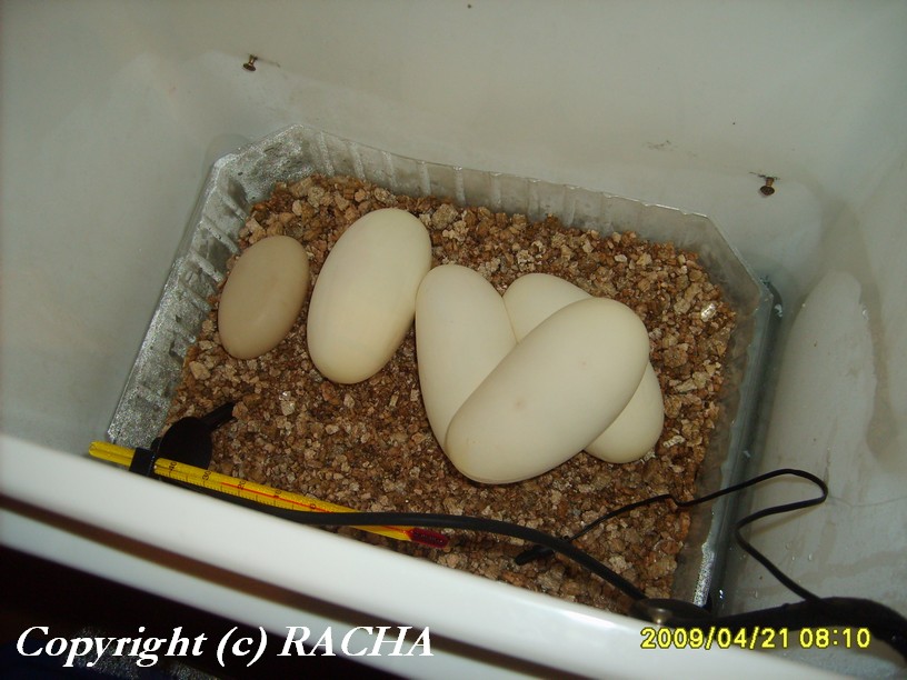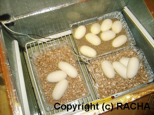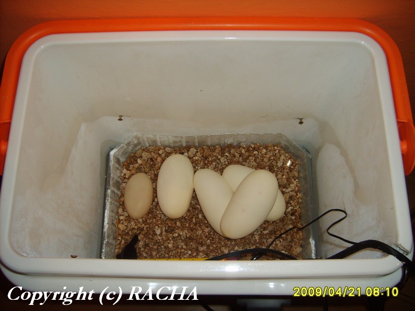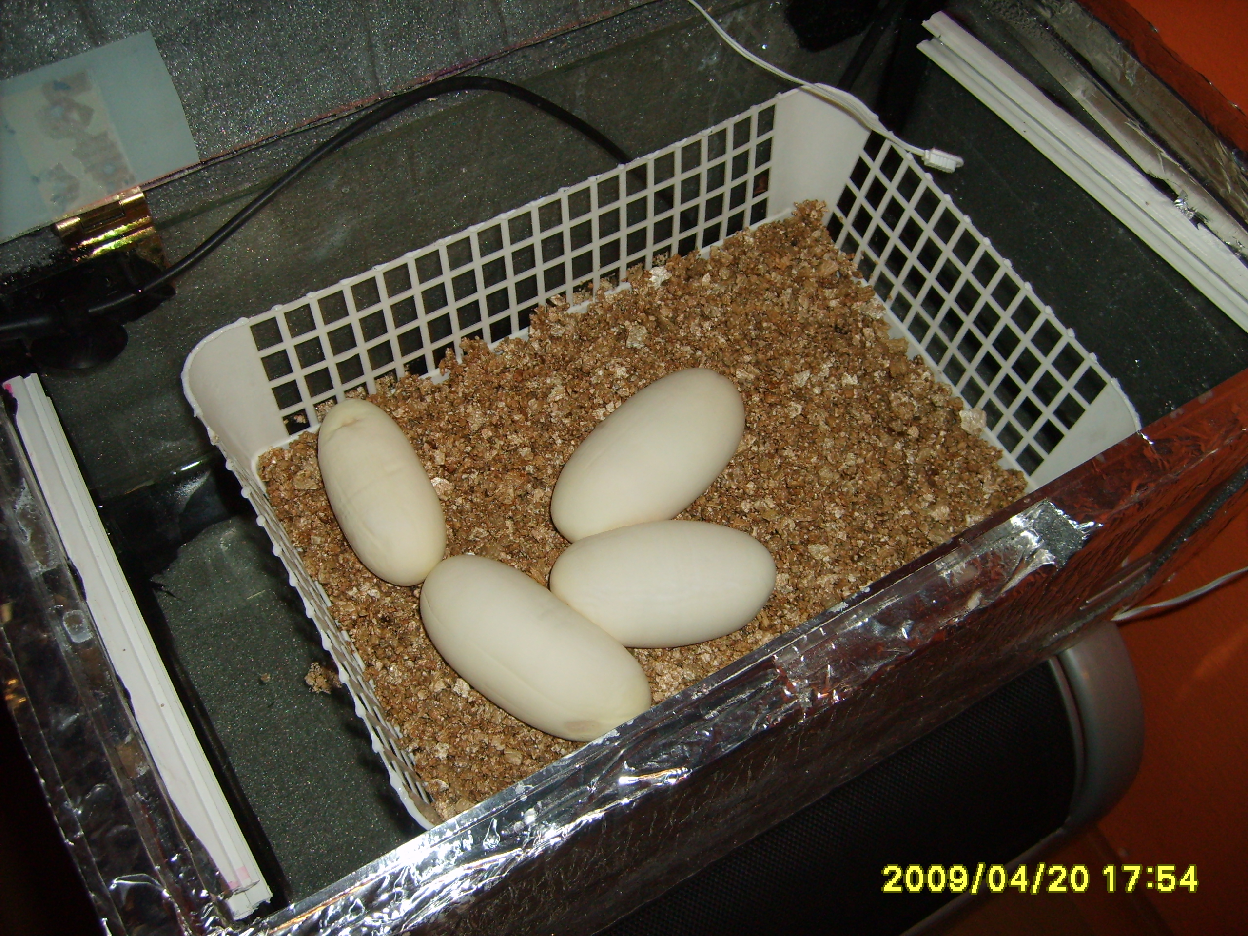 Přesně na zelený čtvrtek brzo ráno mi trachemiska vzorně snesla pět vajec do připraveného substrátu - už jsou v inkubátoru