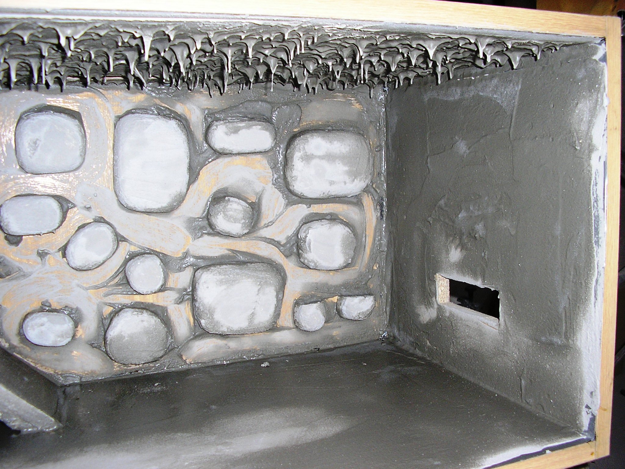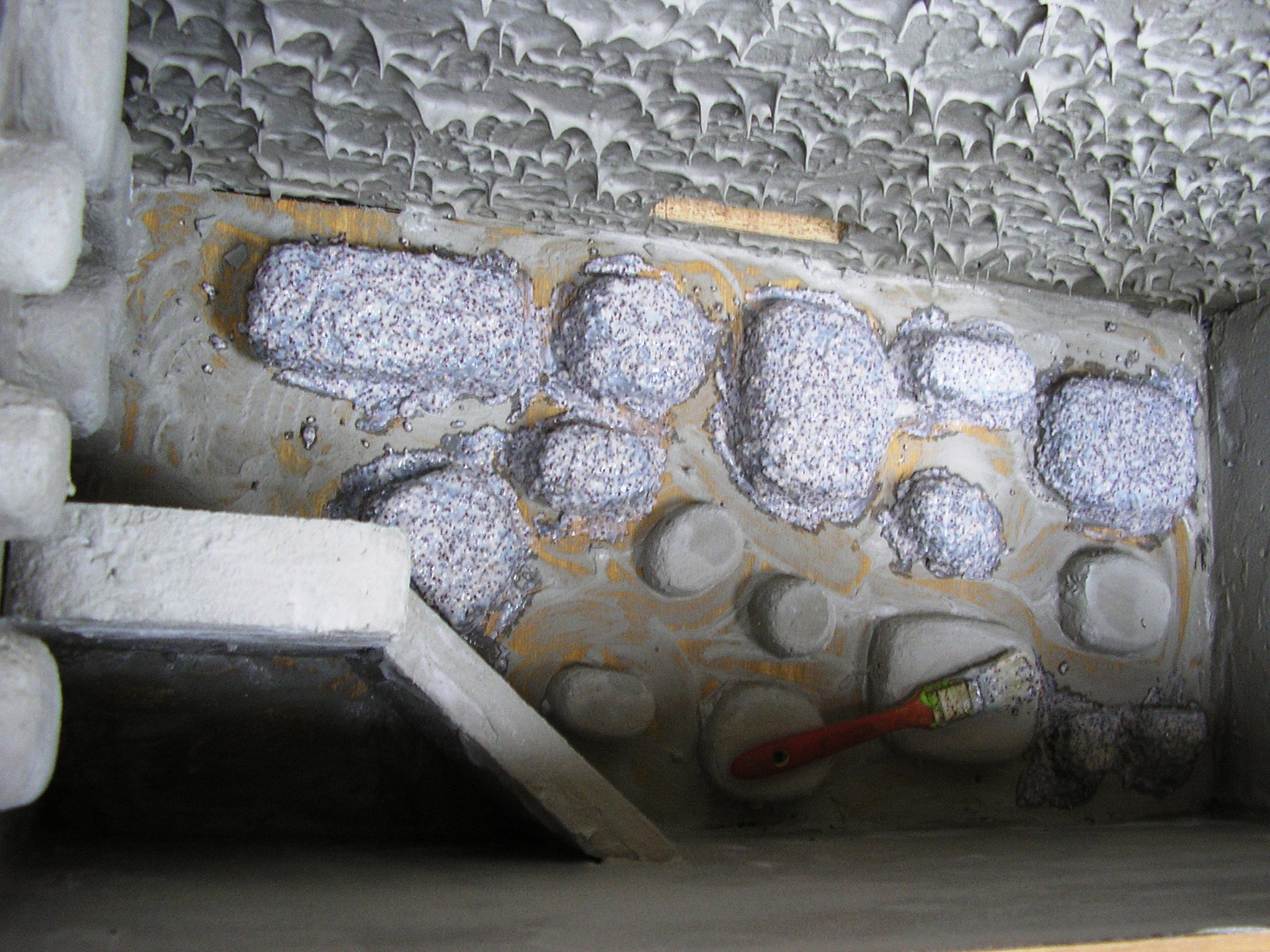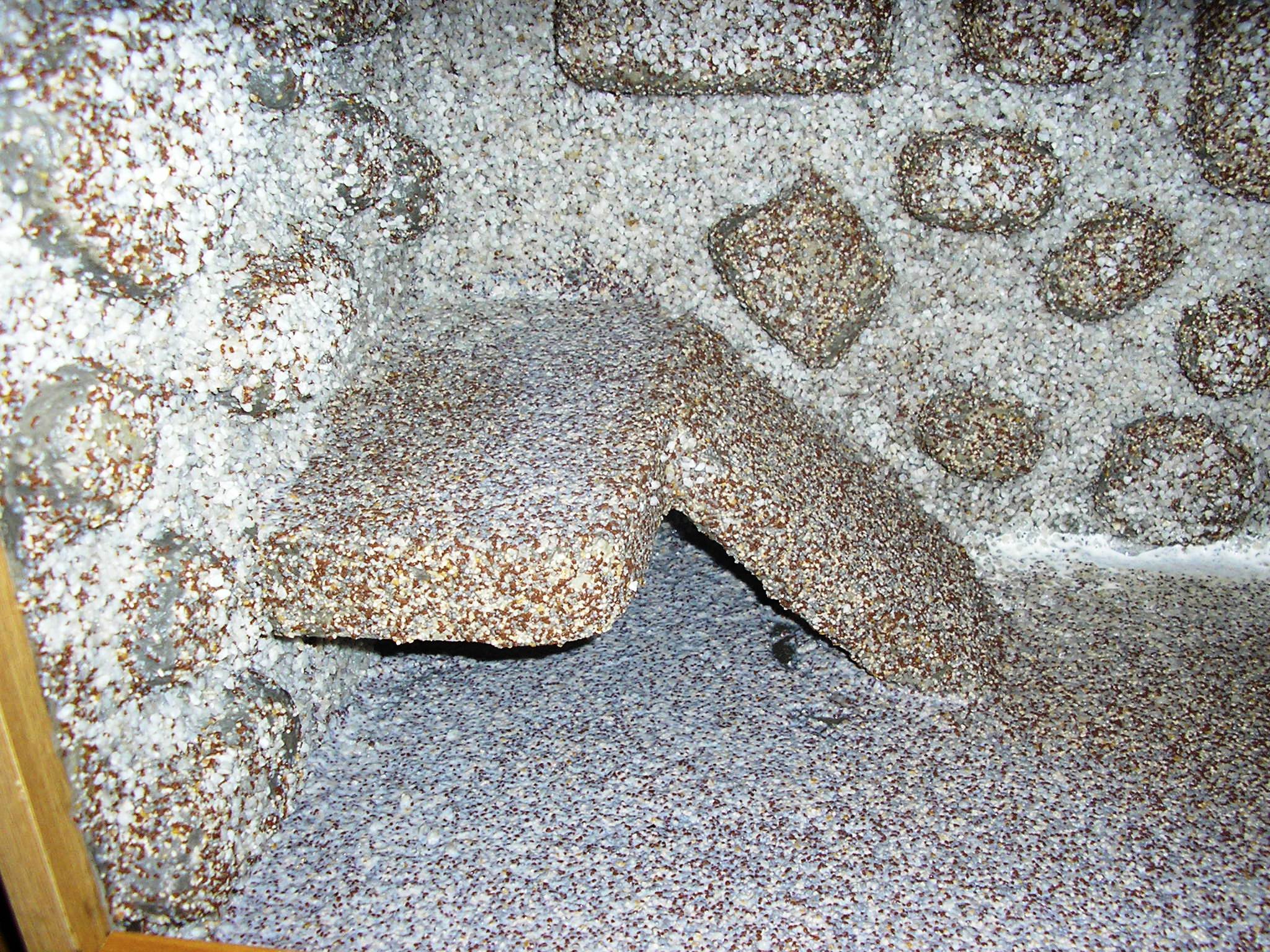 Polystyren - vytvarování (pomocí horkého nože), opískování (epoxid + písek), lepidlo na dlaždičky (obojí 2x - 3x), konečná úprava (barvení - balakryl). Vše maximálně 2-3 dny.