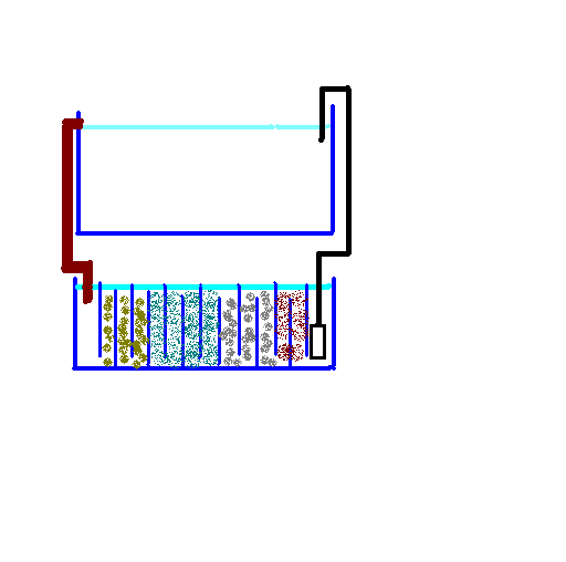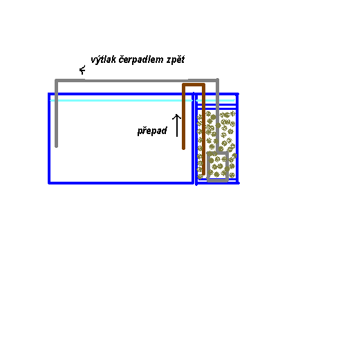 Proč máš dvě přepadové nádoby??? Není jednodušší udělat jednu, která by byla stejně vysoká jako akvárko, celá nádoba by byla vlastně úzké akvárium vedle samotného akvária přepažená několika přepážkami (na střídačku jednou průtok zdola jednou zhora), v první by bylo čerpadlo, které by hnalo vodu do akvárka, v poslední přepadová trubka z akvária (nebo naopak) a mezitím v několika přepážkách filtrační média (štěrk, akvacit atd.).