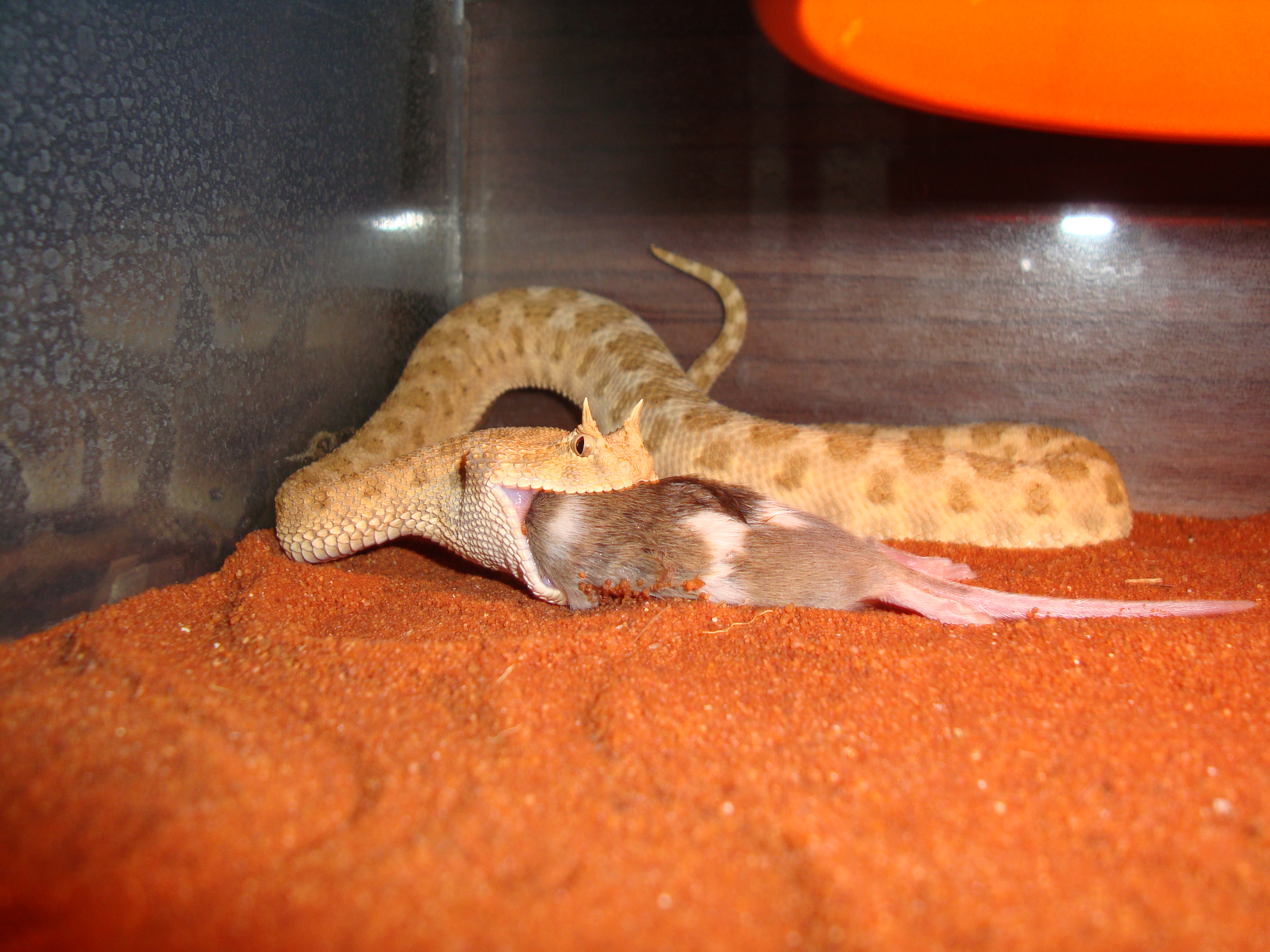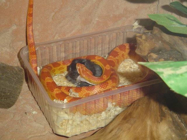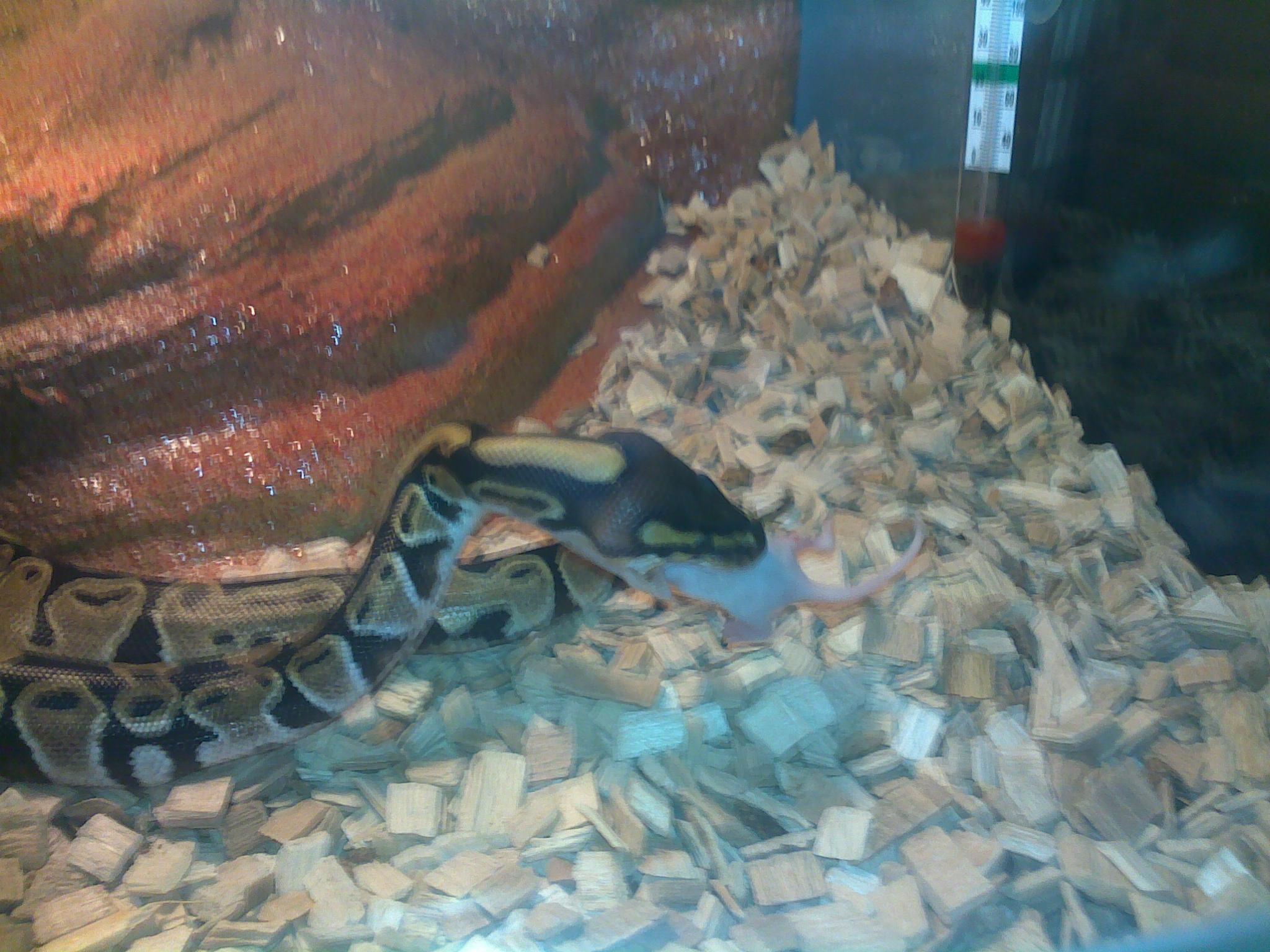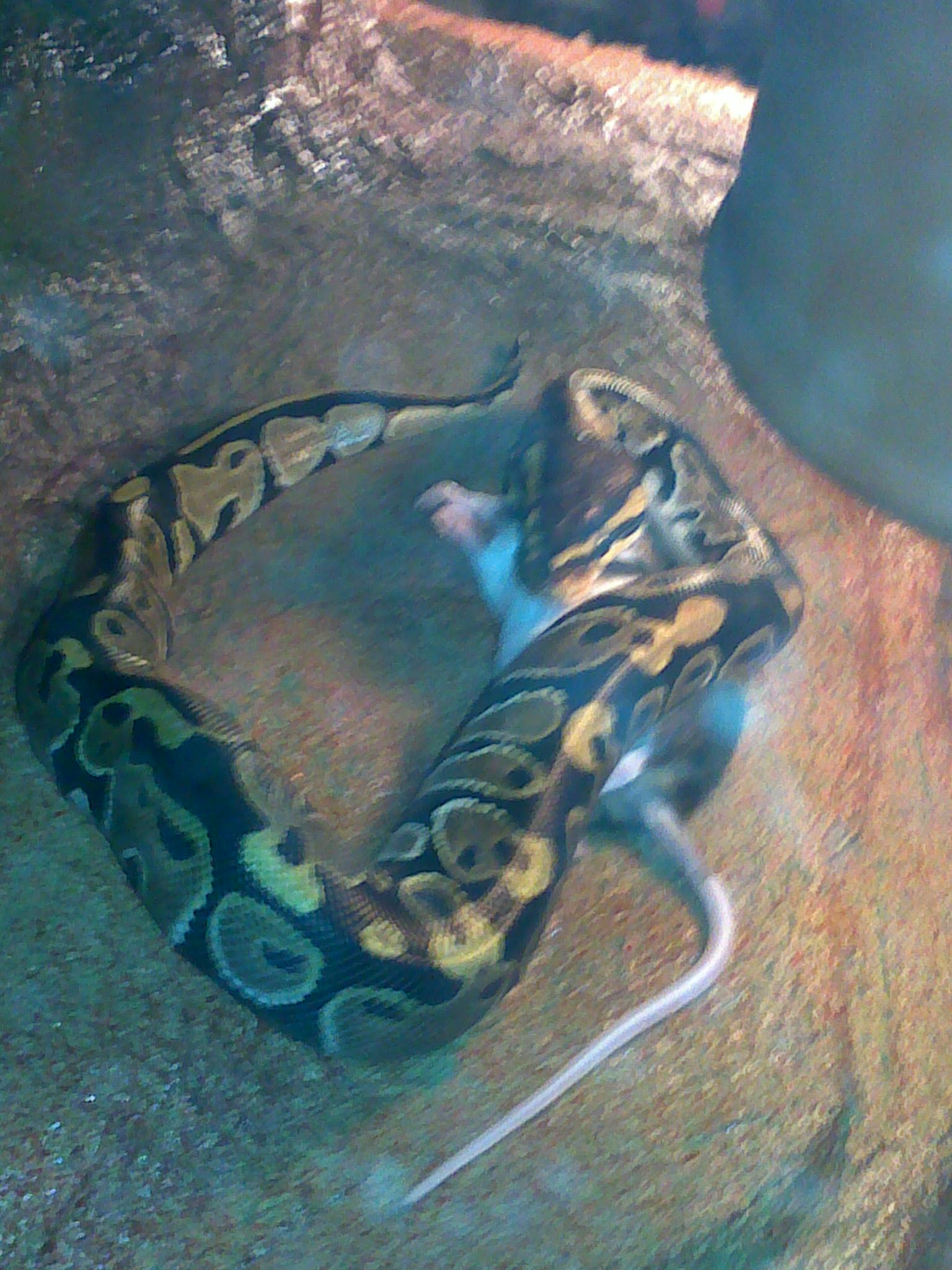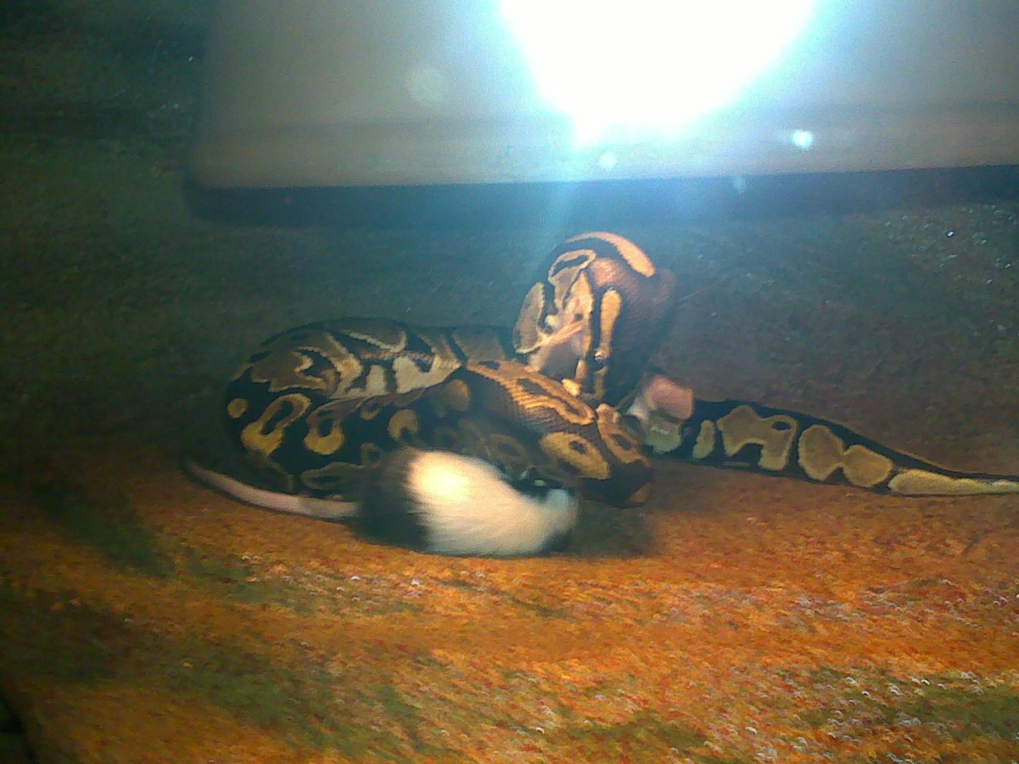 Potrava byla v obou případech předhozena mrtvá. Pg začal v klidu hned polikat (škrtit začal, až když jsem potkana začal tahat za ocas