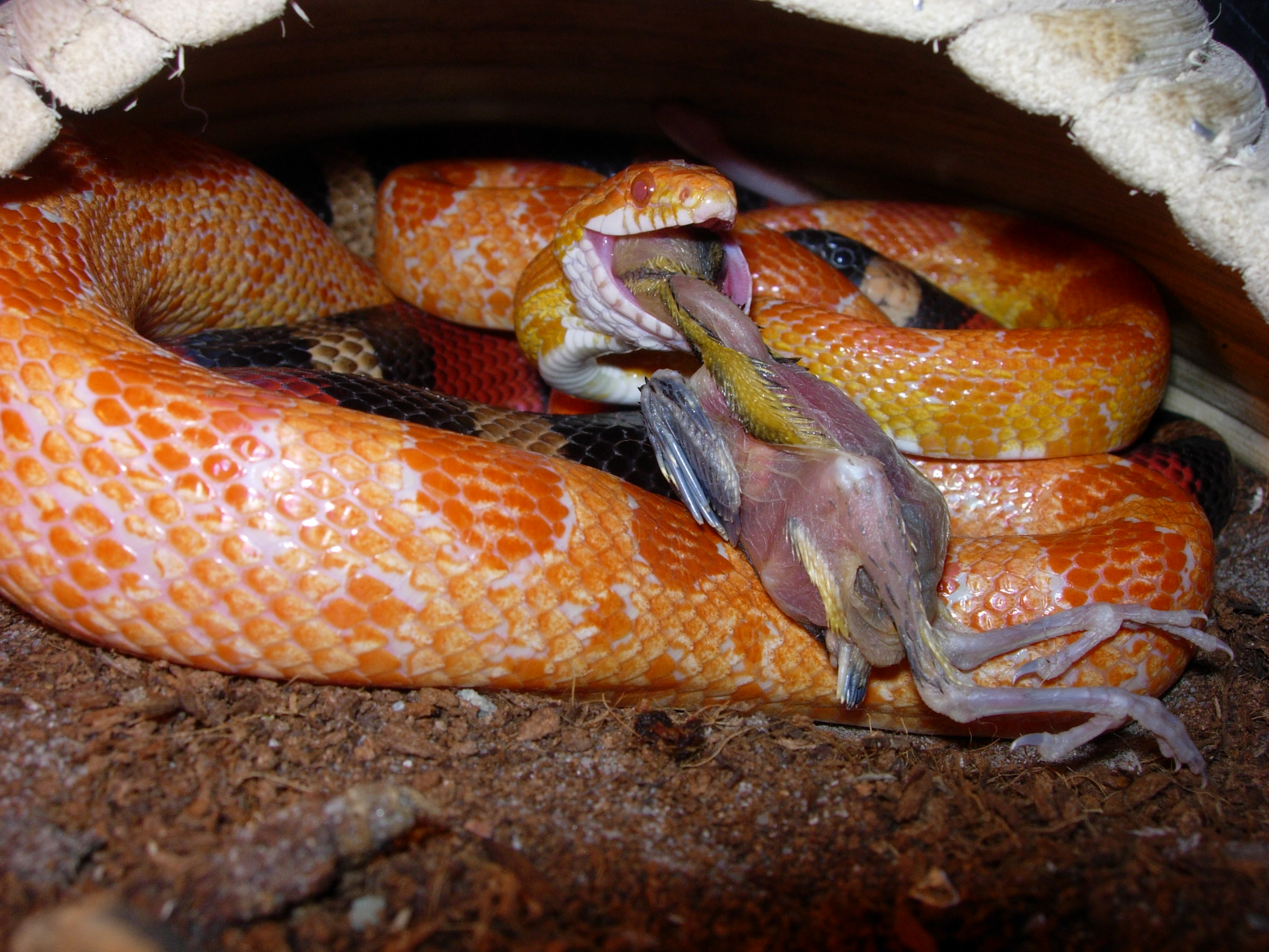 Nejprve by to chtelo trošku vysvětlit- jsou to sykory koňadry, naše kočky chytili a sežrali oba rodiče a tak v budce uhynulo všech 6 mláďat. Ty jsem na druhý den vybral z hnizda a nabidl je svým hadům. Sežrali je vsechna, presto ze byla mrtvá. Nikdy predtim mi mrtvou potravu brat nechteli.