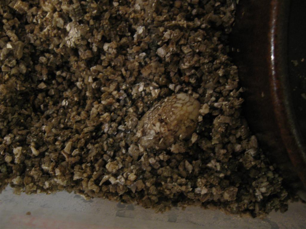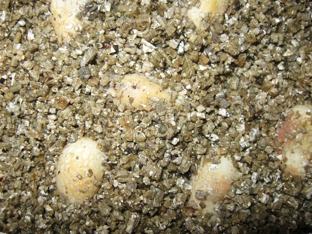 Nyní je v "inkubátoru" teplota mezi 27-28 °C, udržujeme vlhký vermikulit a vlhkost vzduchu asi těch 80%. Topné tělísko nemáme, tak jsme tam přidělali žáovku. Jenže zrovna včera jsme vejce kontrolovali a našli jsme jich hodně splasklých, tak jsme navlhčili vermikulit, dodali vodu...