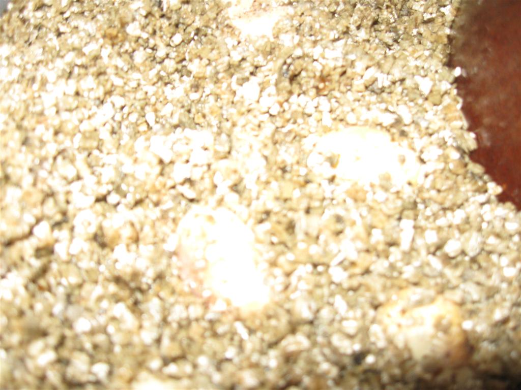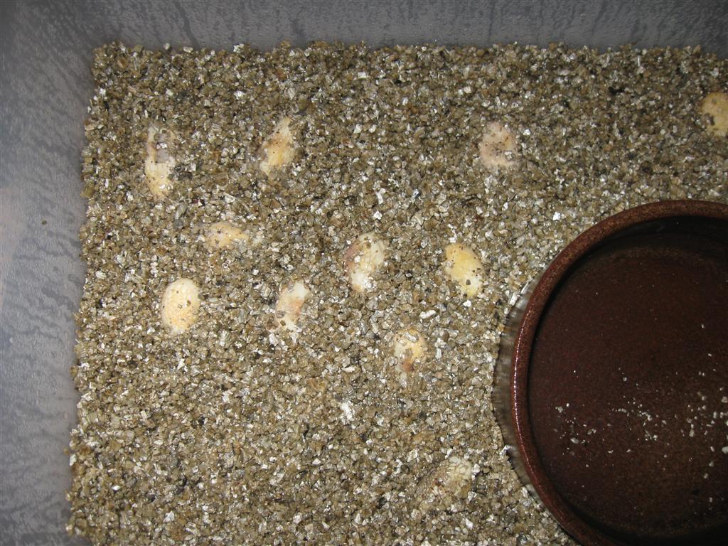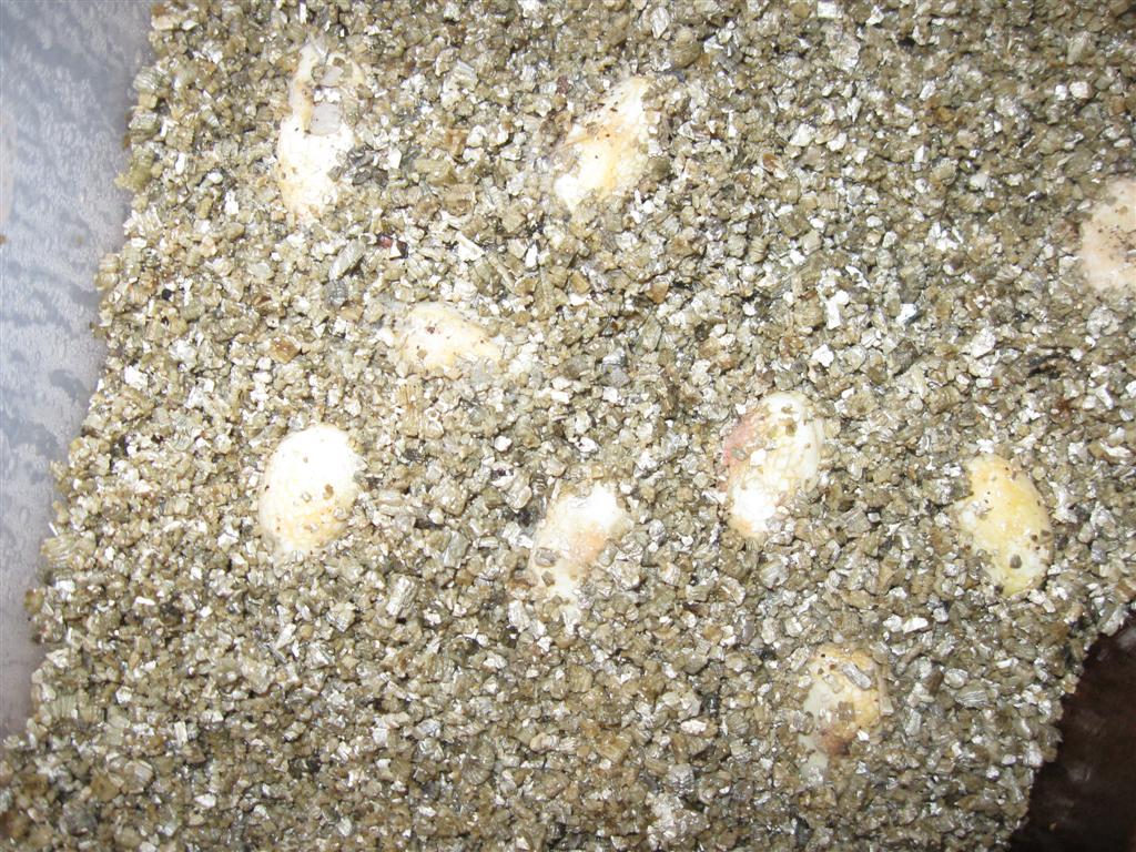 žádnou krupičku nepozoruji, mají lehce popraskanou vápníkovou vrstvu. Je možné ž je to nadměrnou vlhkostí. Proč máte ve vlhkém vermikulitu ještě misku s vodou? Odpar ze substrátu stačí a vodu jen jednou za čas dolejete. Je možné že jsou špatná nebo neoplozená, ale nemůsí to být pravda. Pokuď není inkubátor kultivační médium pro bakterie a jiné bordely poznáte neoplodněné vejce pouze prosvícením. Má totiž stejnou bariéru jako oplodněné a normáně nasává vodu a roste s ostatními. Jestli máte pochybnosti dá se jedno vejce klidně prosvítit nebo otevřít a budete vědět na čem jste. Barva u chameleoních vajec je bílá po nakladení a mají-li relativně suchý obal. Jestli je v okolí dostatek vlhkosti mohou mít na sobě mapy, popřípadě se barví s vývojem zárodku z žlutavé přes růžovou až k zelené před líhnutím.