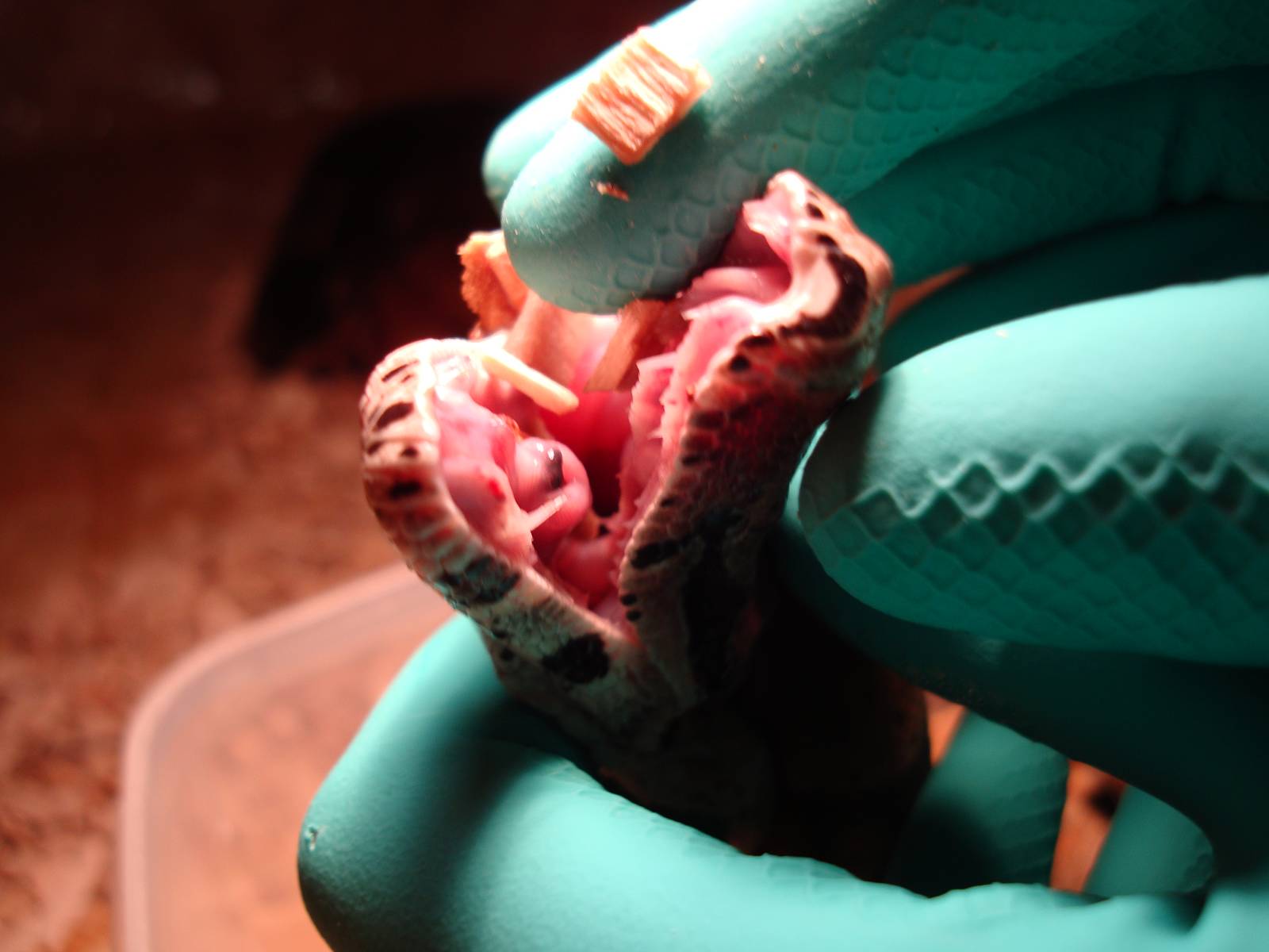 zapachala. Hada jsem tedy vzal a okoupal ho ve vane, protoze se v ni samozrejme vyvalel. Spolu s nim i samce druheho - pro jistotu. Nasakle bukove stepky jsem odstrani, mokre misto umyl navlhcenou hadrou a vratil jse zpet. Dneska rano jsem vstal, niceho zvlastniho jsem si nevsiml - jezel schouleny v klubicku. Pred hodinou jsem se vratil ze zkousky a citim zase ten sileny smrad! Kouknu na hada - oteviral usta a jakoby si narovnaval celist -zarazilo me, ze mel usta (horni a dolni celist) do "V", kdyz byste se podivali z vrchu. Vypadal, ze mel nejake krece a usta mel zaslinene, mozna to byla ta tekutina. Sel jsem pro hadr, kdyblik, ze to zas umeju, chtel jsem ho odsunout a konec