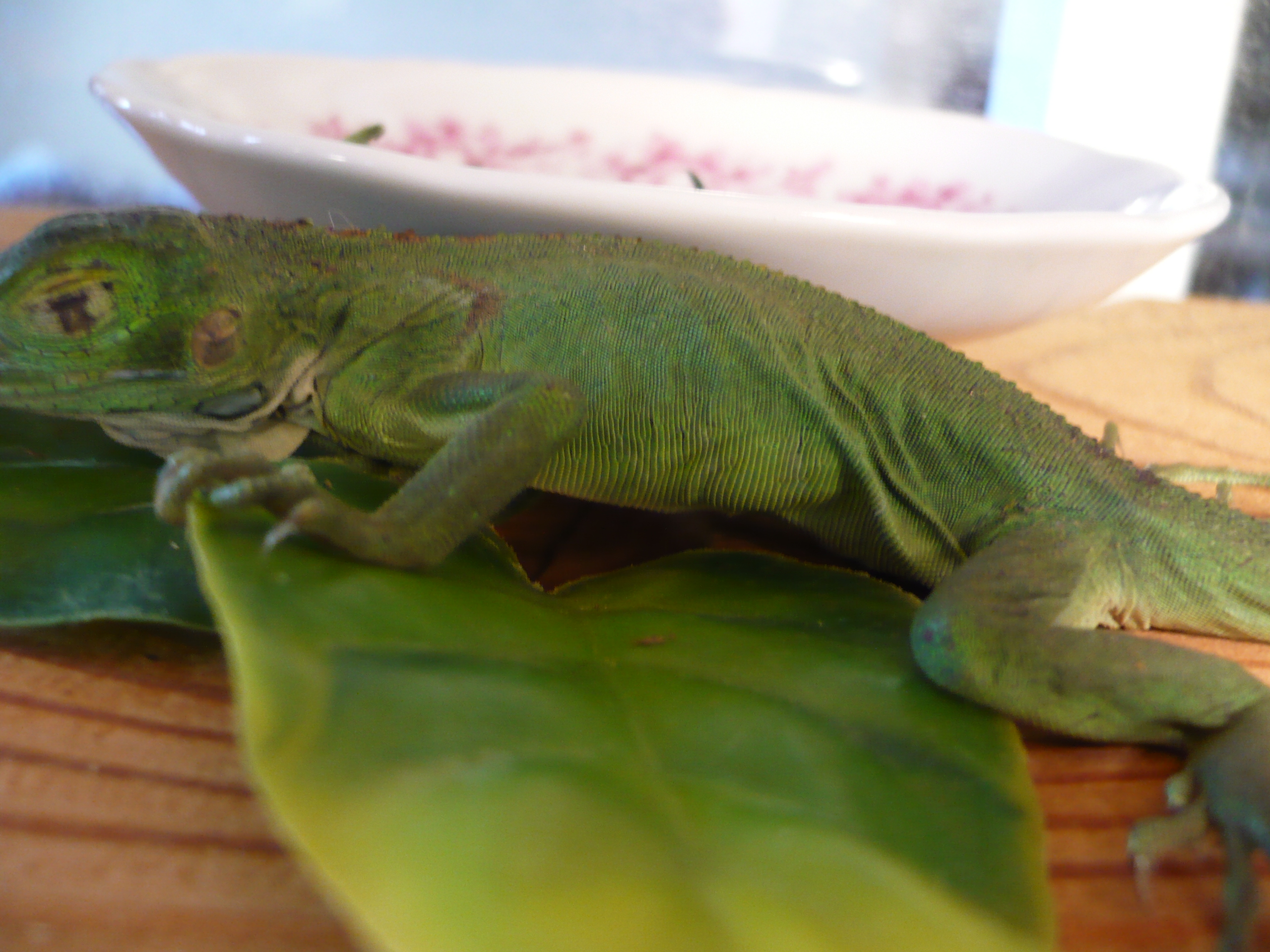 Dneska jsem leguána trochu pohladila, nebrala jsem ho do ruky, jsem přes něj lehce přejížděla. Byl v pozoru, ale nechal se. Potom jsem ho trochu pokropila a teď už je na větvi, takže se pohnul. Tudíž hurá :)