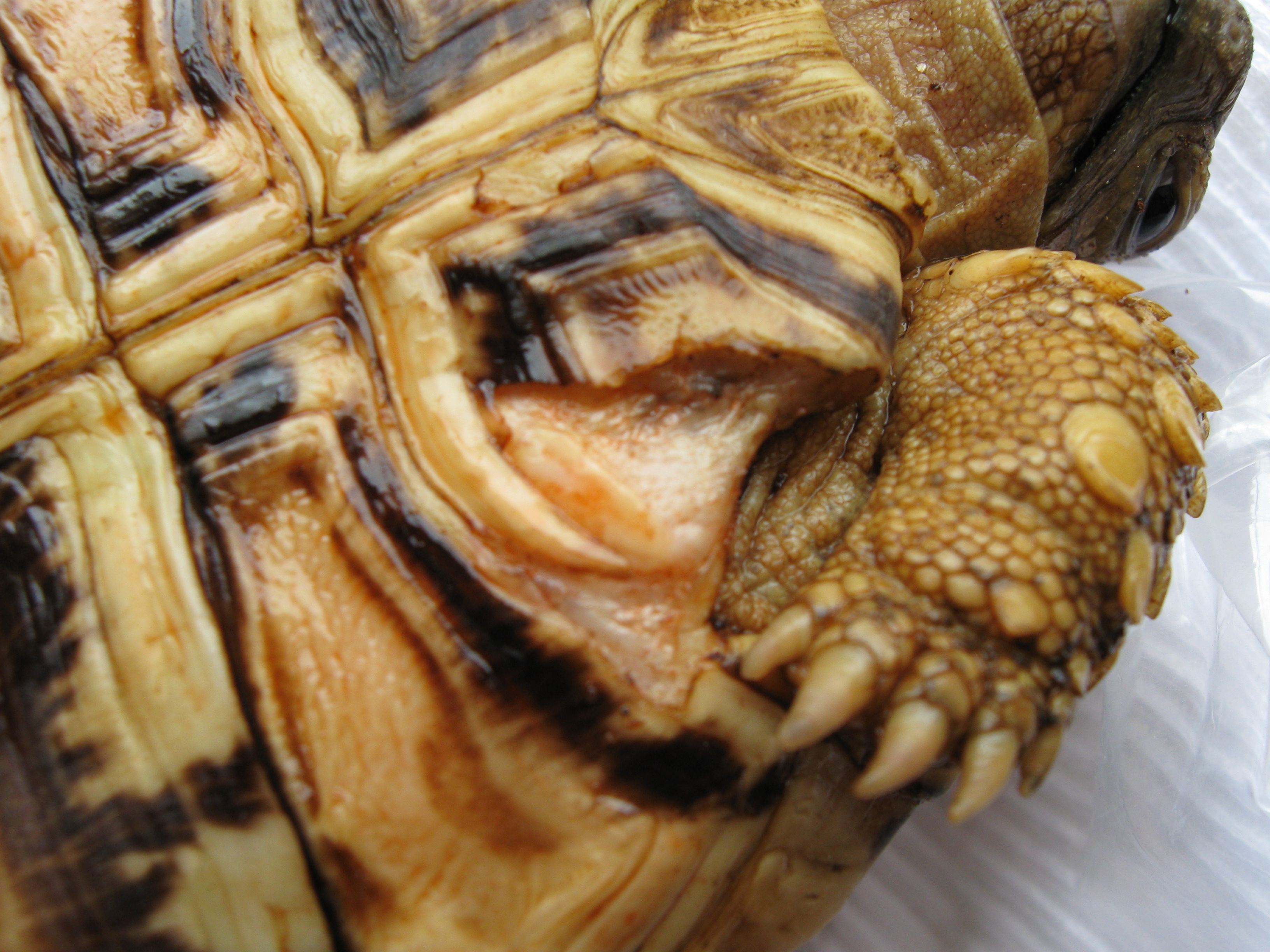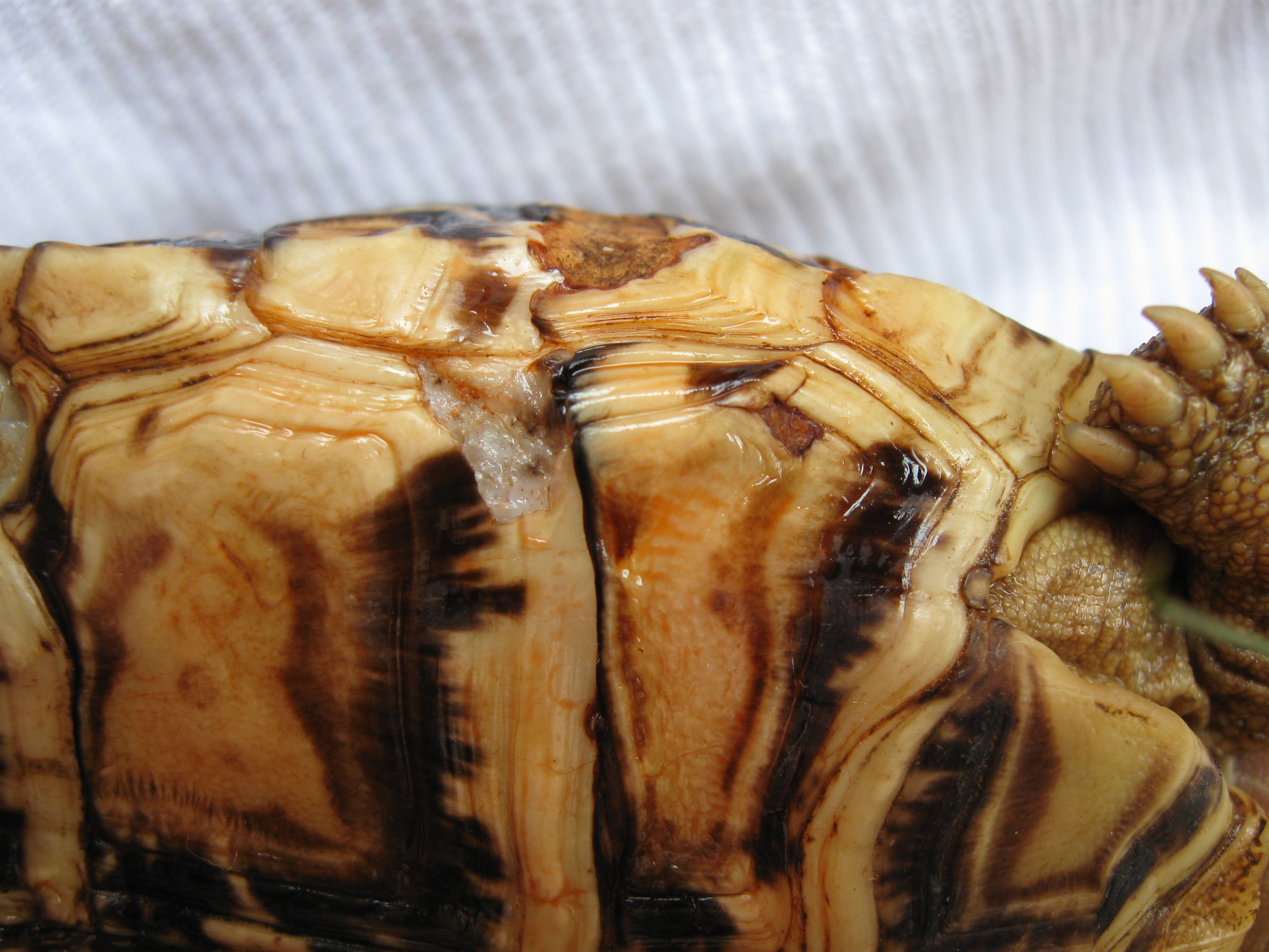 Ahoj, prosím o rady. Tuto želvu jsem izoloval od ostatních (má to jediná ze 30). Starou mrtvou tkáň jsem odstranil a vydesimfikoval vyčištěná místa. Dnes jsem želvičku vykoupal v roztoku hypermanganu. Jinak je aktivní a dobře žere, vypadá jak kdyby o těch ránách ani nevěděla. Poradíte, co s tím mám dělat dál? A popřípadě co je to za druh plísně? Setkal jste se s tím už někdo? Je to pěknej hnus...