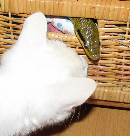 Mám dva hady, kluka a snad holku, holka je mladší divoká, neustále vystrašená a v pozoru, takže je zalezlá v úkrytu. Kluk je pravý opak, pohodový, zvídavý a mazlivý. Když to jde, tak ho vykoupu a pouštím proběhnout po bytě. Plazí se všude možně i na knihovnu, netuším co ho tam láká. Nakonec když je mu zima, tak za mnou přileze a přitulí se pod deku.