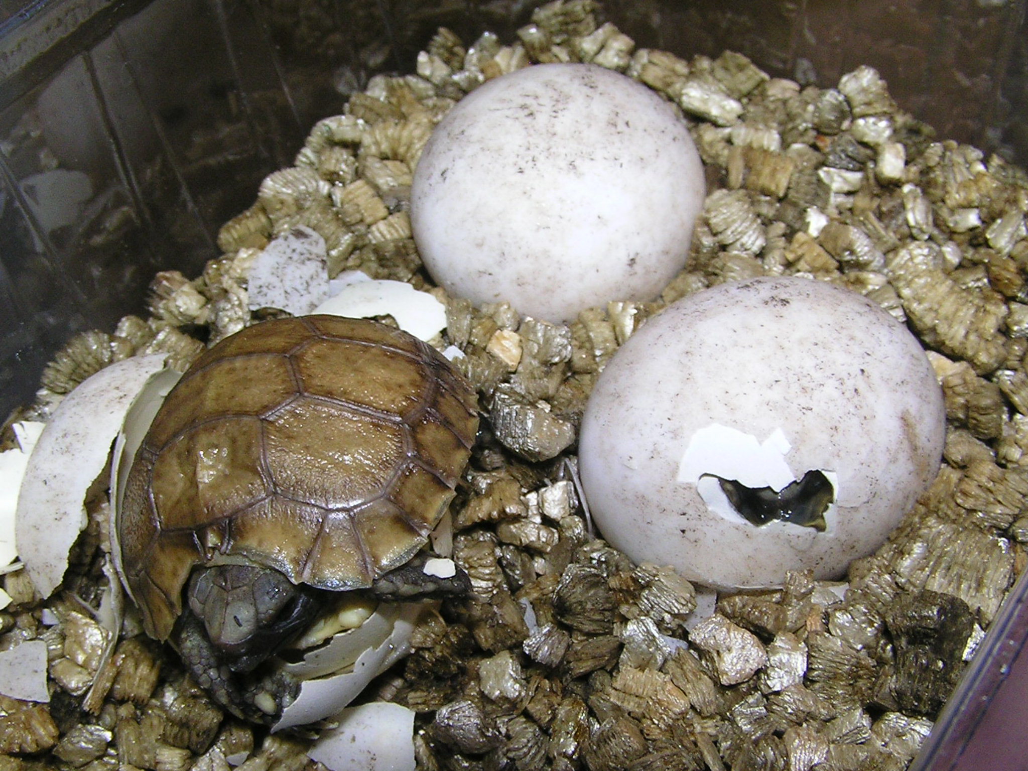 s dotyčným triem po necelém roce chovu to vypadá následovně- celkem brzy, už asi za měsíc po koupi začal samec jevit zájem o samice a ani ne po 2 měsících aklimatizace se želvy začly pářit. Na podzim 1 ze samic vykladla 2 snůšky, první o 6 a druhou o 3 vejcích v rozmezí asi měsíce a půl. Další samice vykladla jen 1 snůšku, taktéž o 3 vejcích. Vejce byla dána do inkubátoru. Všech 6 vajec z první snůšky bylo oplozených, ale mláďata ve vejcích uhynula krátce před vylíhnutím. Z druhé snůšky se mláďata vylíhla po 122 dnech inkubace mimo inkubátor, jen v krabičce na teráriích.