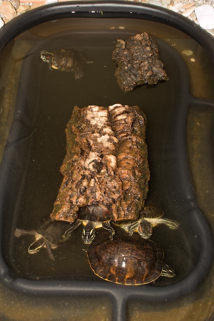 Přidávám balkonovou ,,želví vanu" + další fotky: zleva: Fanny a Horatio Nelsnovi, trachemyš Beruška, trachemyš Bublinka (pro někoho popelnice, pro mě nejkrásnější želva na světě). Ještě tam byla jedna graptemyška, ale dost se bála,navíc venku asi nastydla, tak jsem ji raději vyexpedovala domů.