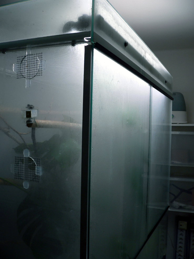 rozměry 135d 70h 125v, vodu dávám vodovodní upravenou reverzní osmozou f. ROWA a následně převařenou. Hlavní potrava Blaptica dubia, když bylo teplo tak jsem jim tam občas hodil koníka, saranče, můru apod. teď někdy vyjímečně dostanou cvrčka a 2x do měsíce jedno myší holátko. Kvákání je v pohodě, asi jako běžně chované Agalychnis callidryas, možná o trochu vyšší a škála rozhodně pestřejší. Myslím, že se dost bojí, až po půl roce jsem je viděl žrát, jsou opatrní, např stále nevím kdo kváká... ale myslím, že k sobě jsou dost agresivní, o tom jsem se přesvědčil u podobného druhu Pachymedusa (Agalychnis) dacnicolor.