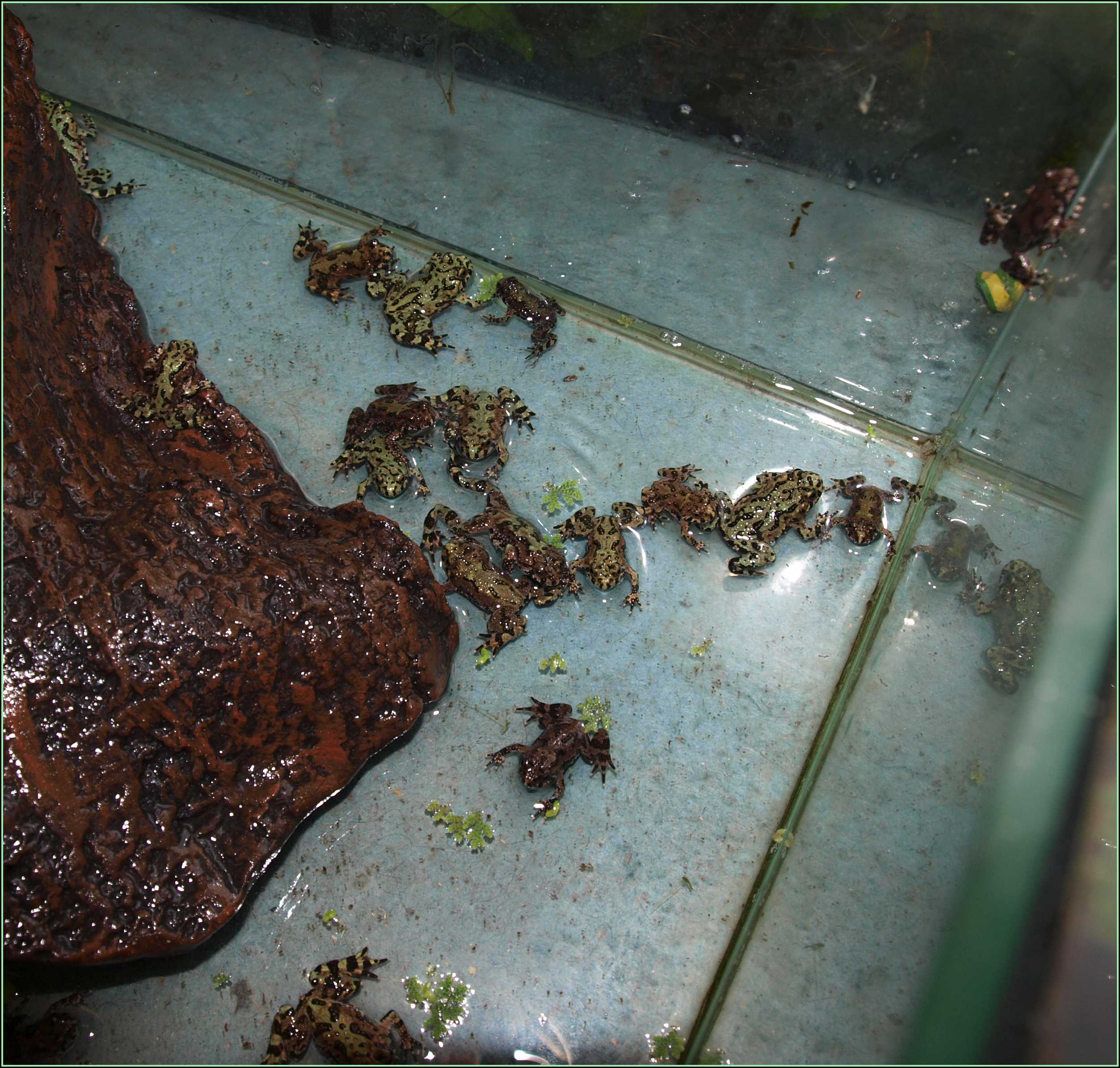 Jsou to docela magoři. Odchovoví se tak nechovají, ale odchytoví, když se vylekají, tak bezhlavě skáčou a naráží do stěn. Po čase se trochu uklidněj a nereagujou na věci, co se dějí pořád, jančí akorát když se stane něco, co neznají. Hlavně potřebujou úkryt pod vodou, aby se mohli schovat. Jinak je chov docela v pohodě, nijak nároční nejsou. Co se týče odchovu- letos byla první snůžka, ale malá a bylo z ní jen pár pulců, žáby jsou teď cca 3 leté a ještě asi nejsou uplně zralé, hlavně samice. Příští rok snad bude líp.